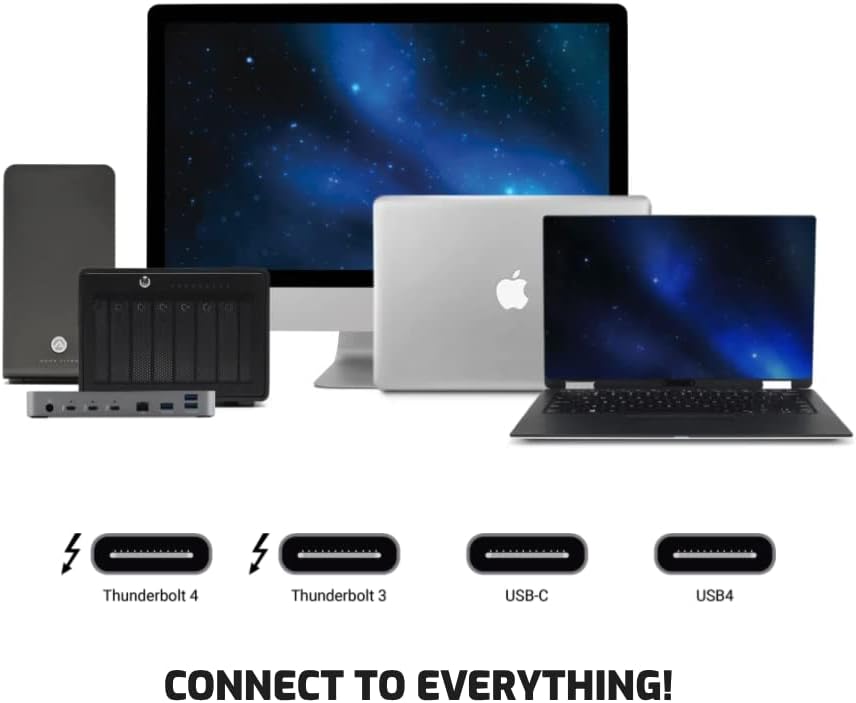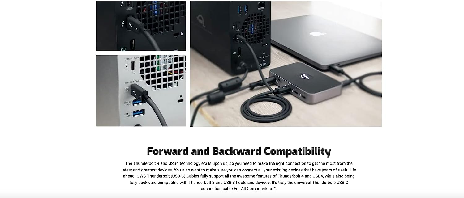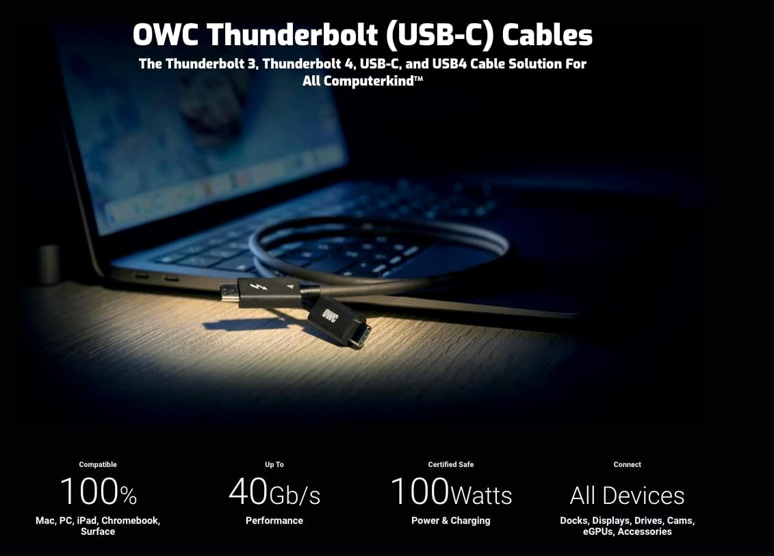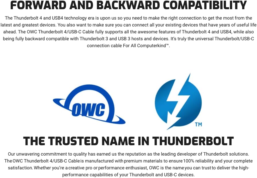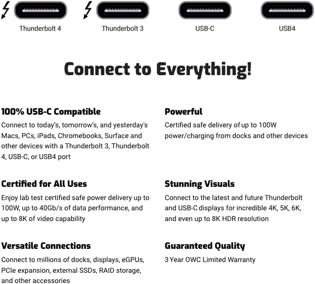 • 100% USB-C Compatible:The OWC Thunderbolt 4 Cable fully supports all the awesome features of Thunderbolt 4 and USB4, while also being fully backward compatible with Thunderbolt 3 and USB 3 hosts and devices. A plug and play safe solution Compatible with any Mac, PC, iPad, Chromebook, Surface tablet or ny other device, display, or power supply with Thunderbolt 3, Thunderbolt 4, USB-C, or USB4 port.