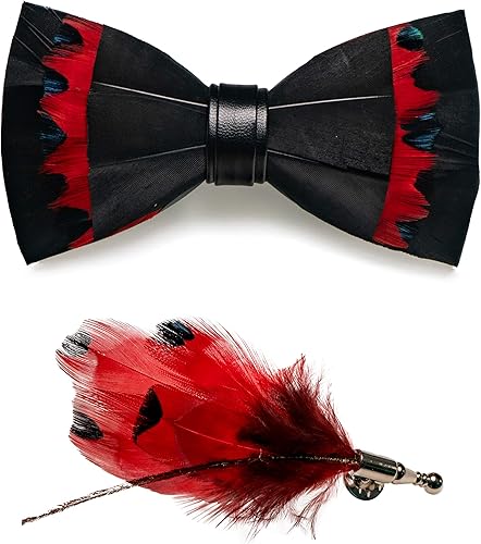 RBOCOTT Handmade Feather Pre-tied Bow tie and Brooch Sets for Men