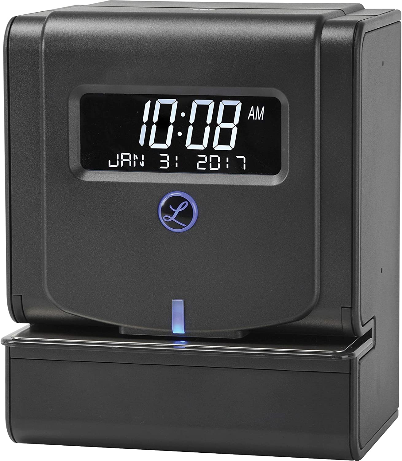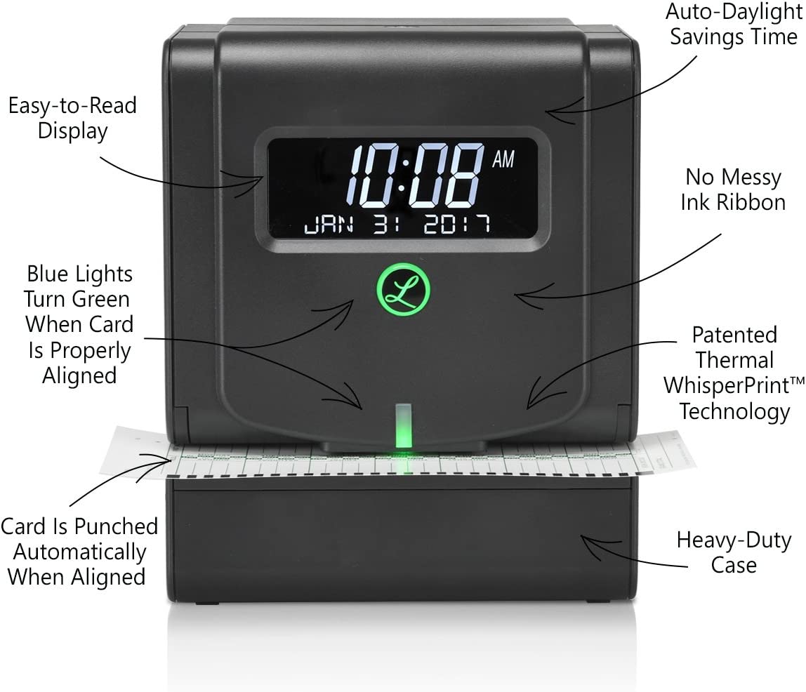 Thermal print time clock features WhisperPrint technology that eliminates the need for print ribbons to provide maintenance-free operation. Heavy-duty construction is made of durable steel and ABS materials that allow it to withstand harsh environments and high cycle volume use. High-contrast LCD clearly displays the time and date for easy visibility. Automatic printing allows simple, one-handed operation for convenient use. Tru-Align technology senses when the time clock's printer is aligned correctly with the proper space on the time card to ensure that your employees make the perfect-punch on their time cards every time. Innovative rotary knob lets you quickly set up print formats, set time formats and select English, French or Spanish language settings all in less than 5 minutes. SmartClock technology with perpetual calendar retains your time, date and settings during power outages, and auto-adjusts for Daylight Saving Time and Leap Years.