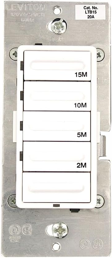 With four preset buttons and one OFF button, the Leviton LTB30 Timer is easy to use. Simply press the button for the amount of time you want a light or motor load to remain on--the device will automatically turn off when the time period has expired. Press and hold the top button to initiate override or press and hold two buttons to convert the preset 30-minute timer into another time interval.