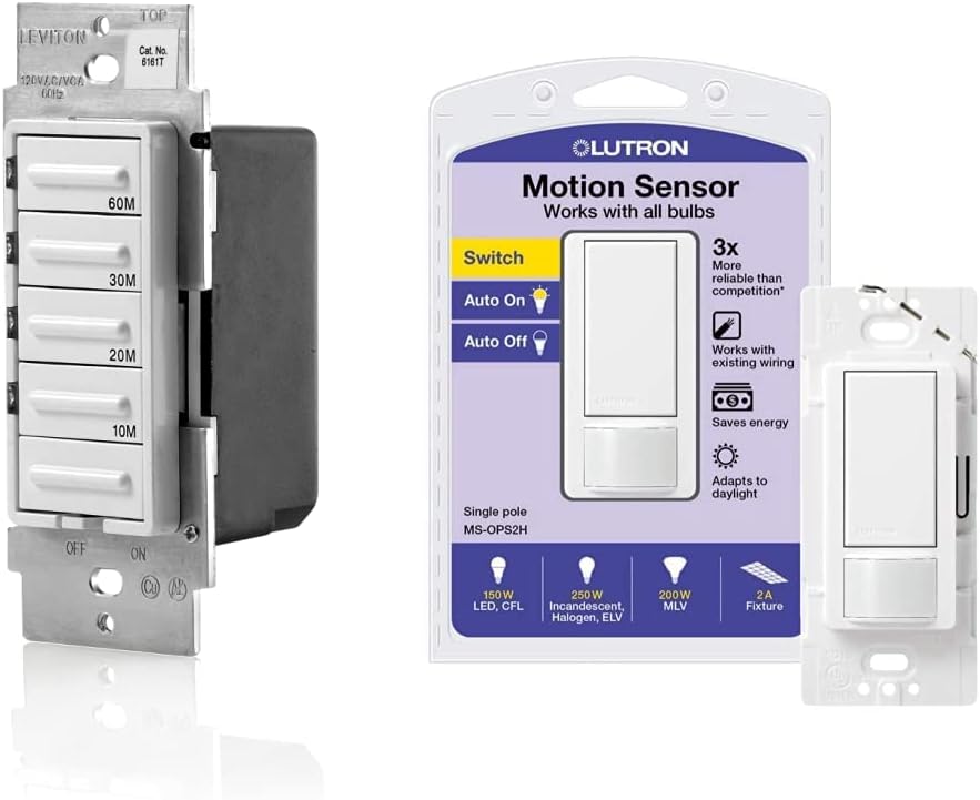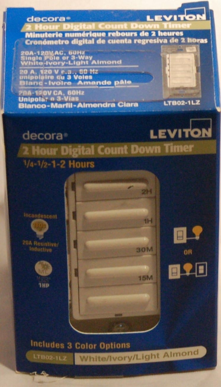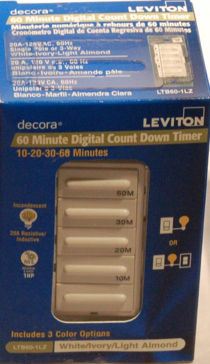 Leviton offers many products that will help lower electrical costs and add convenience to everyday living. By simply replacing standard switches with timer switches will reduces energy consumption and extends bulb life. Better than ever - Leviton Decora (R) Timer Switches offer advanced features, superior accuracy and contemporary aesthetics. Our robust selection provides convenient timed control of lighting and motor loads in homes, offices, schools, hotel rooms and other small commercial applications. Homeowners can set lights to turn on and off for a lived-in look while they are away, or automate control of heat lamps, pool pumps or bathroom fans. Our versatile selection includes fully programmable and preset timers in popular styles and colors. All are backed by Leviton's long history of quality and reliability. Decora LTB30-1LZ, 1800W Incandescent/20A Resistive-Inductive 1HP Preset 5/10/15/30 Minute Countdown Timer Switch, White/Ivory/Light Almond. Decora is a registered trademark of Leviton Mfg. Co.
