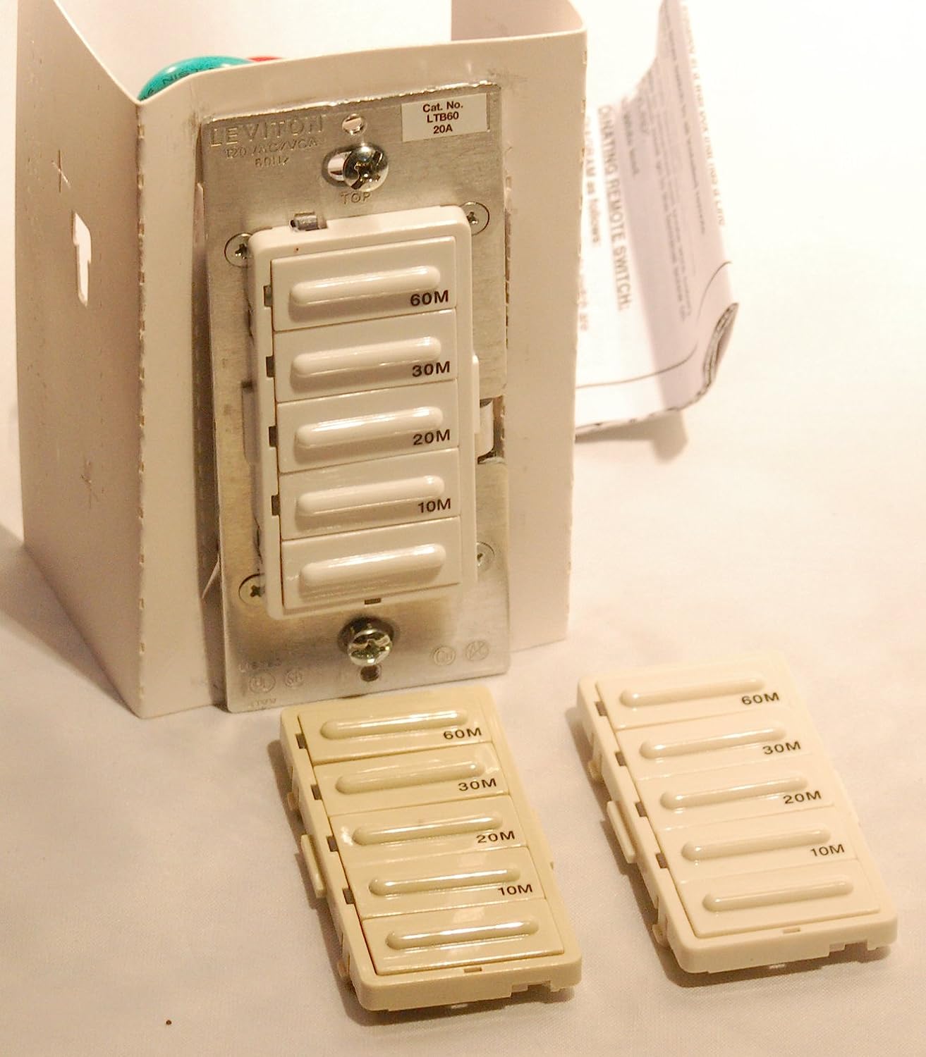 Leviton LTB30-1LZ Decora 1800W Incandescent/20A Resistive-Inductive 1HP Preset 5-10-15-30 Minute Countdown Timer Switch, White/Ivory/Light Almond Faceplates Included