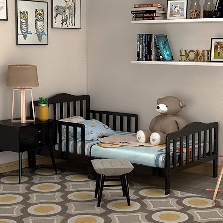 HONEY JOY Toddler Bed Frame, Solid Rubber Wood Frame w/Safety Guardrail, Fits Crib Full Size Mattress (Not Included), Children Classic Sleeping Bedroom Furniture for Kids Boys Girls (Black)