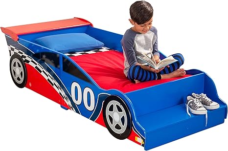 KidKraft Wooden Racecar Toddler Bed with Built-in Bench & Bed Rails - Red & Blue