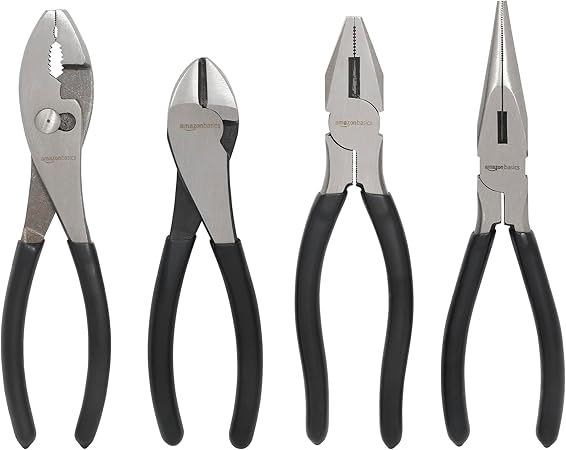 Amazon Basics Pliers Set, Hand Tools for Precision, Set of 4, Black and Silver