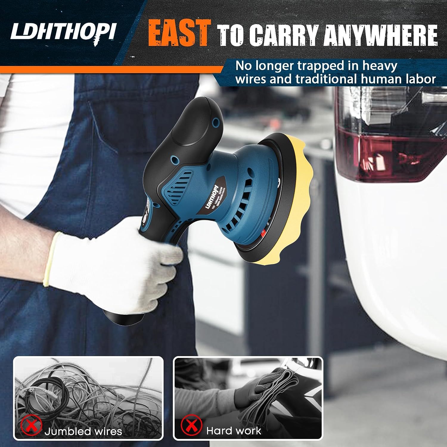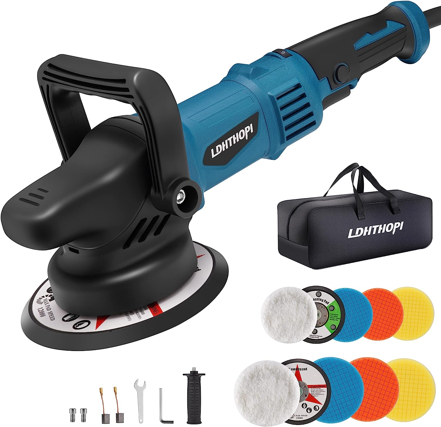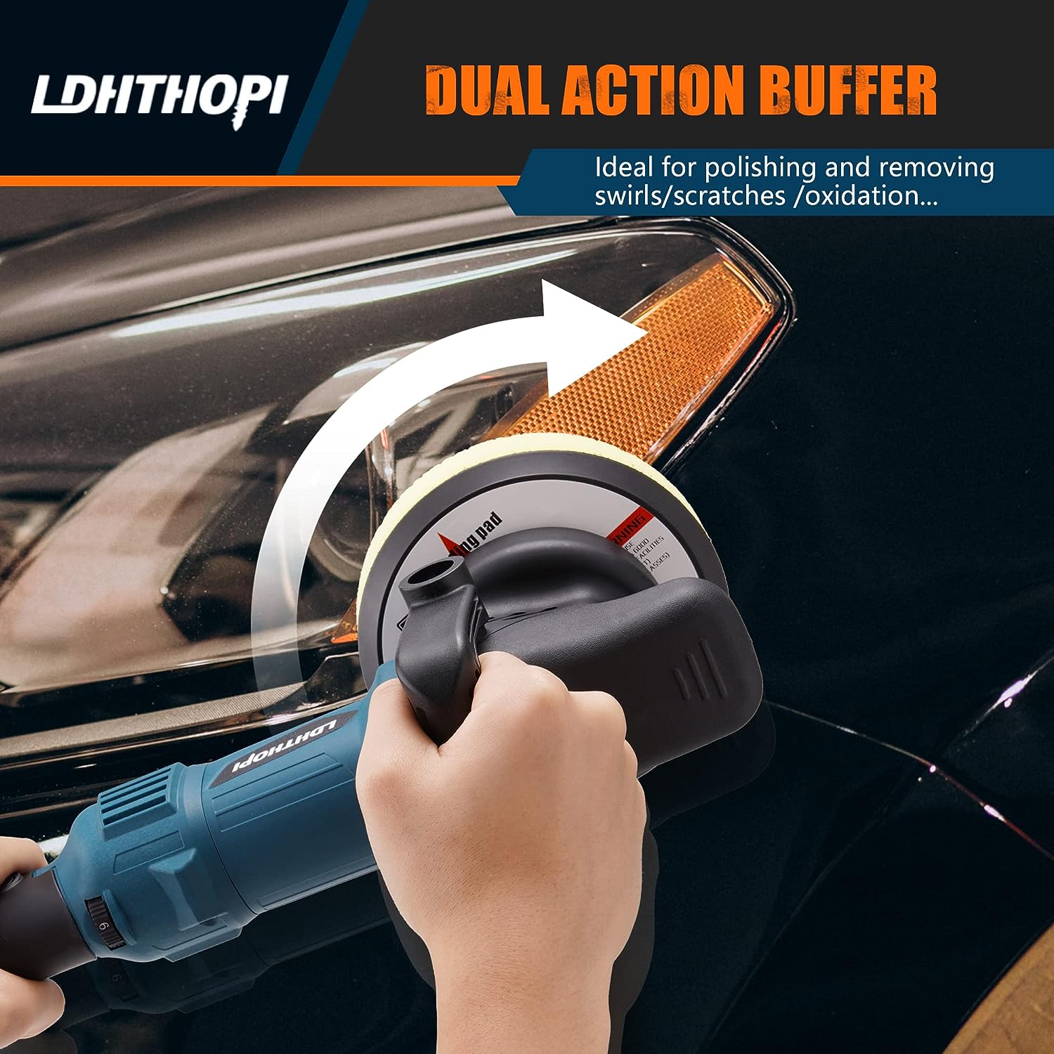 • 【Compact & Ergonomic Design】: LDHTHOPI polisher body size is 15.7"X3.5"X3.1" and weighs only 4.57lbs, the buffer polisher comes with detachable D-handle and side handle. With switch lock design, you can keep the speed by lock down the button, greatly reducing fatigue. Comfortable front grip, curved body sense handle is not easy to fatigue, more accurate operation.