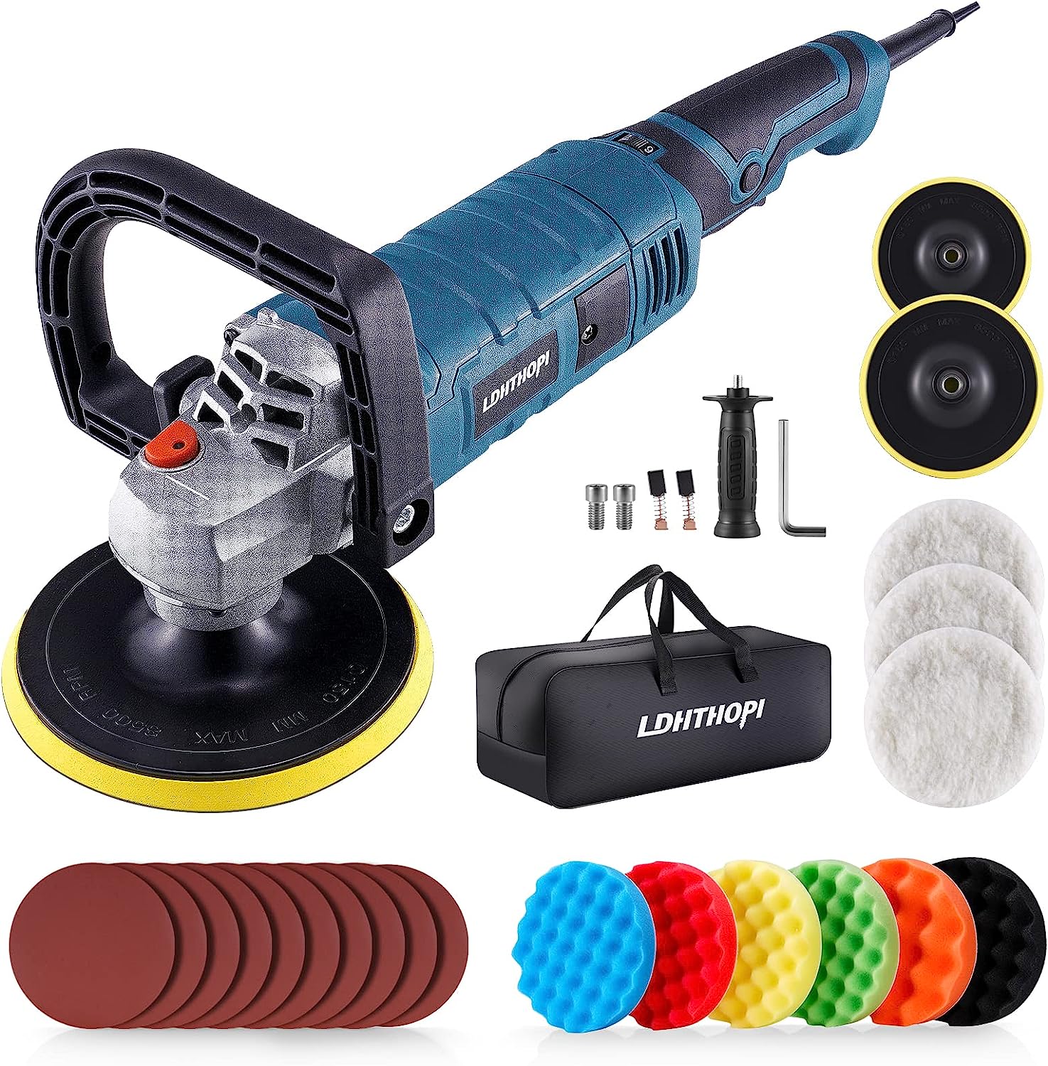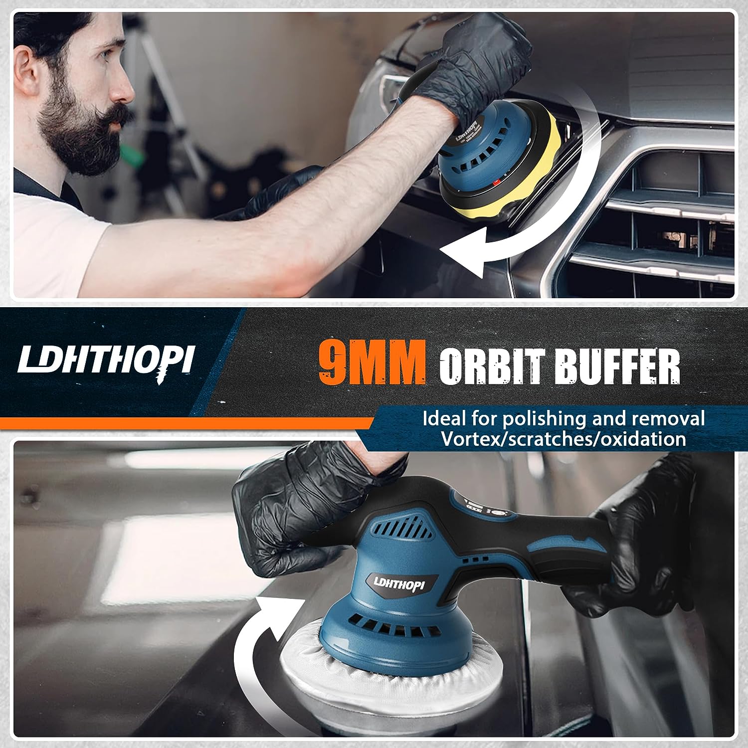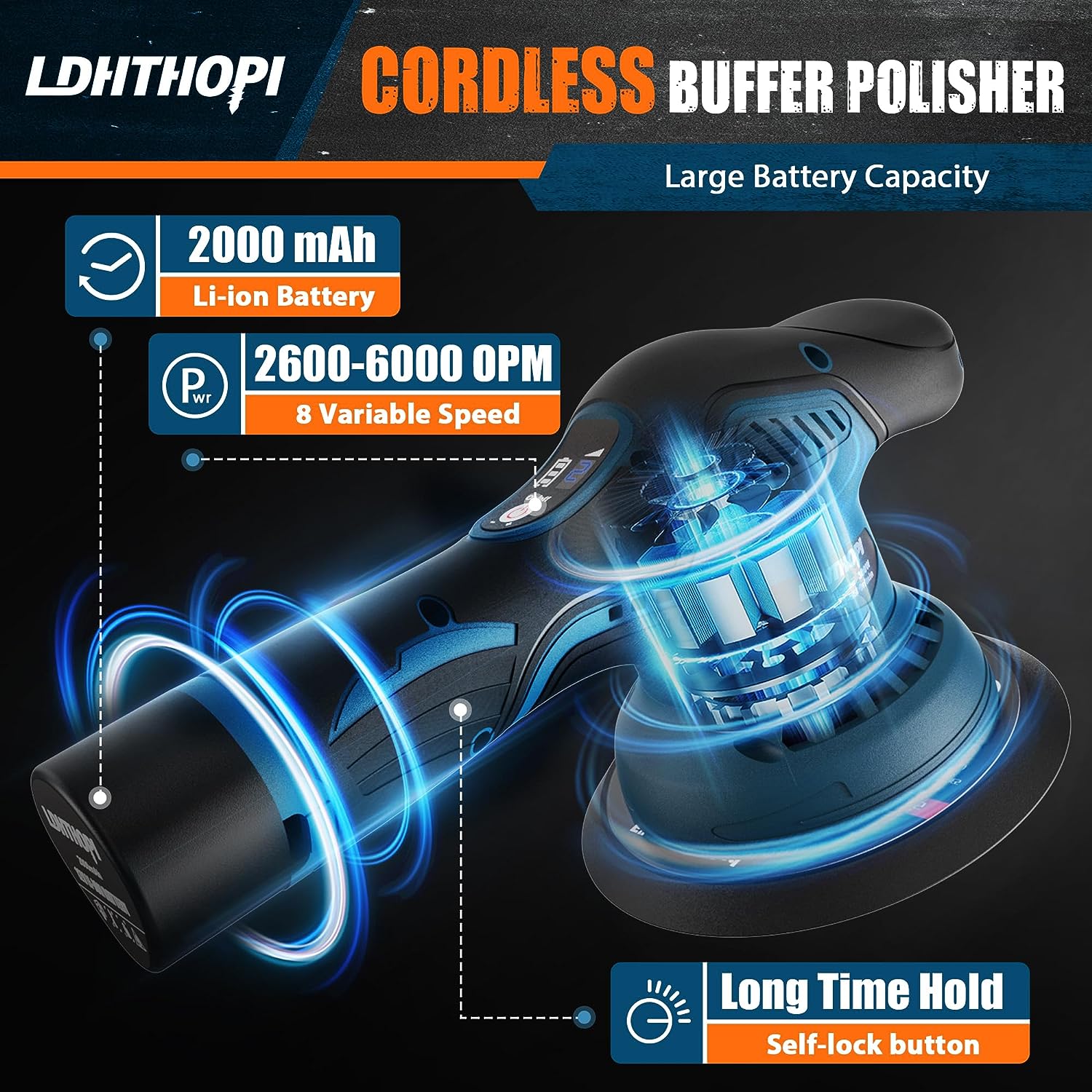 • 【Compact & Ergonomic Design】: LDHTHOPI polisher body size is 15.7"X3.5"X3.1" and weighs only 4.57lbs, the buffer polisher comes with detachable D-handle and side handle. With switch lock design, you can keep the speed by lock down the button, greatly reducing fatigue. Comfortable front grip, curved body sense handle is not easy to fatigue, more accurate operation.