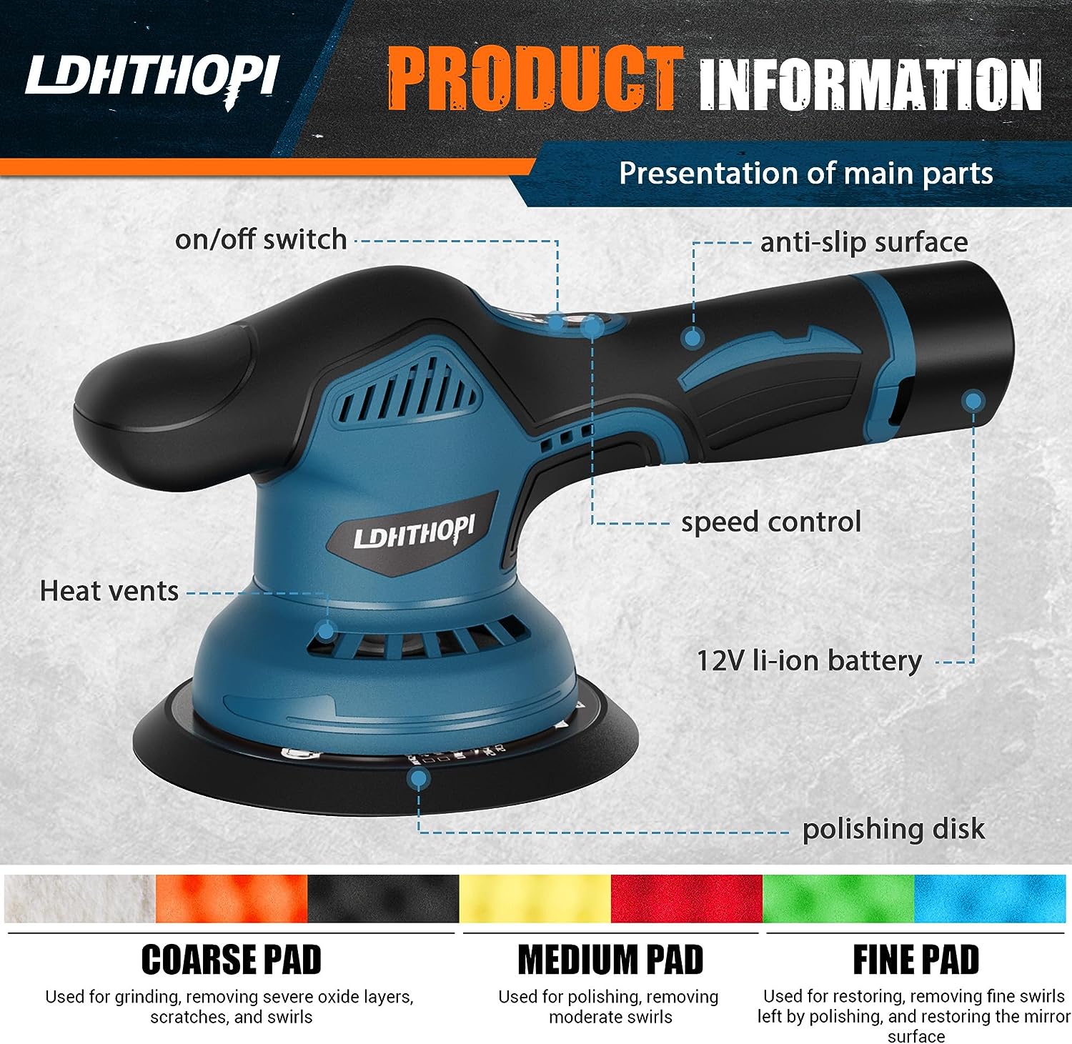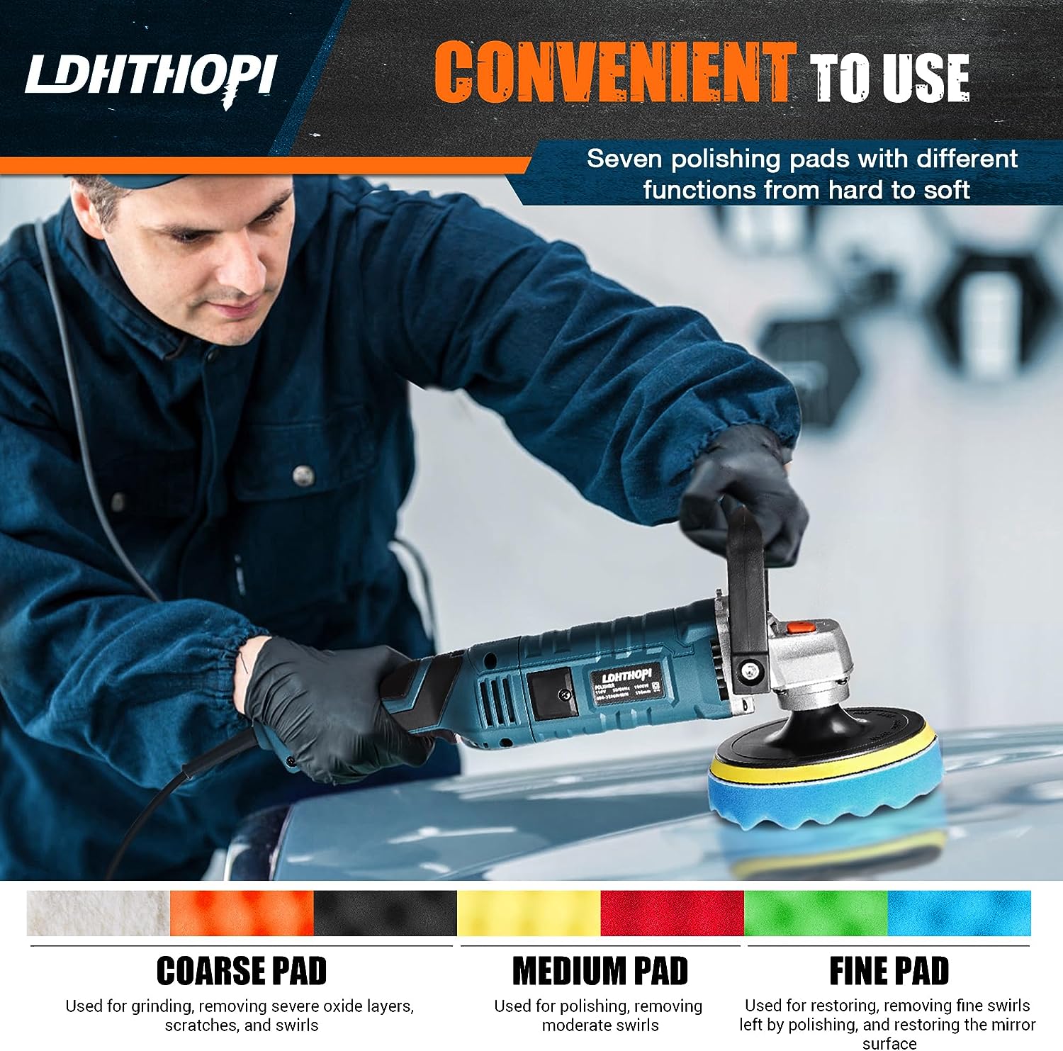 • 【Wide Application】LDHTHOPI buffer polisher comes with sandpapers, foam pads for waxing, wool polishing pads You can use soft or hard foam pads to finish different application. This rotary polisher is ideal for polishing, sanding, waxing, sealing glaze, removing swirls, shallow scratches, excess wax oil and defects from vehicles. You can also use it on furniture, ceramic, wood, aluminum, steel, tiles, plastic and more.