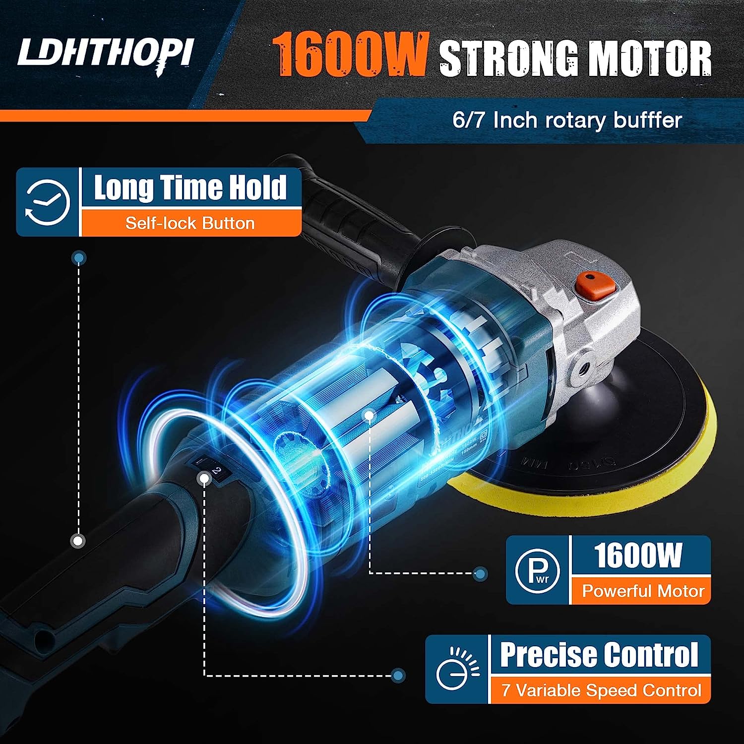 LDHTHOPI Buffer Polisher, 1600W 7 Inch/6 Inch Rotary Buffer Polisher Waxer, 7 Variable Speed 1000-3500 RPM, Detachable Handle for Car, Boat Sanding, Polishing, Waxing