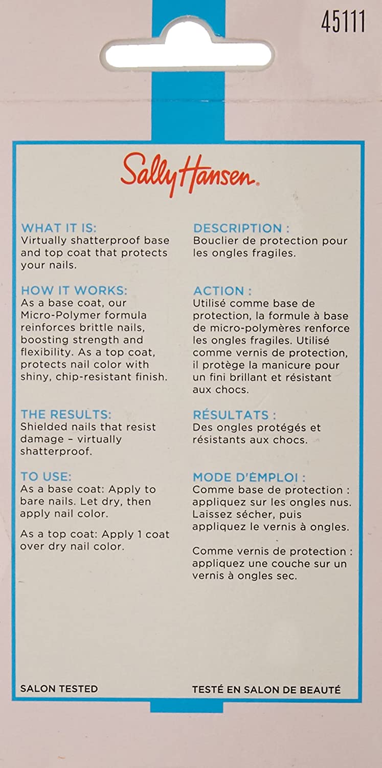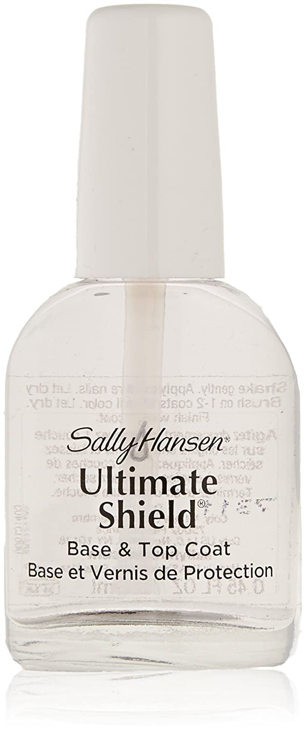 Safeguard your nails with this Sally Hansen Ultimate Shield Base & Top Coat™. The super-resistant gel top coat formula protects brittle nails from chipping, peeling and fading. Apply to bare nails and go, or use it as a base and top coat when applying nail color. Take your nails from weak to virtually shatterproof!