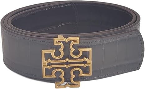 Tory Burch 141154 Britten Bluestone Grey/Dark Mahogany Brown With Gold Hardware Croc Embossed Leather Reversible Women's Belt Size Small