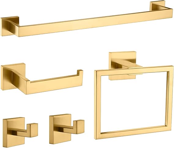 Bathroom Accessories Hardware Set Brushed Gold, 5-Piece Gold Towel Rack Bar 23.6 inch Modern Towel Bar Wall Mount Include Towel Rack Ring, Toilet Paper Holder, Robe Hook