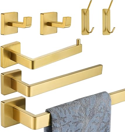 JQK 7-Pieces Bathroom Hardware Set, Bath Accessories Set Brushed Gold Wall Mount includes 24 in Towel Bar, Hand Towel Bar, TP Holder, Towel Hook x 2, Adhesive Hook x 2, BAS257-BG