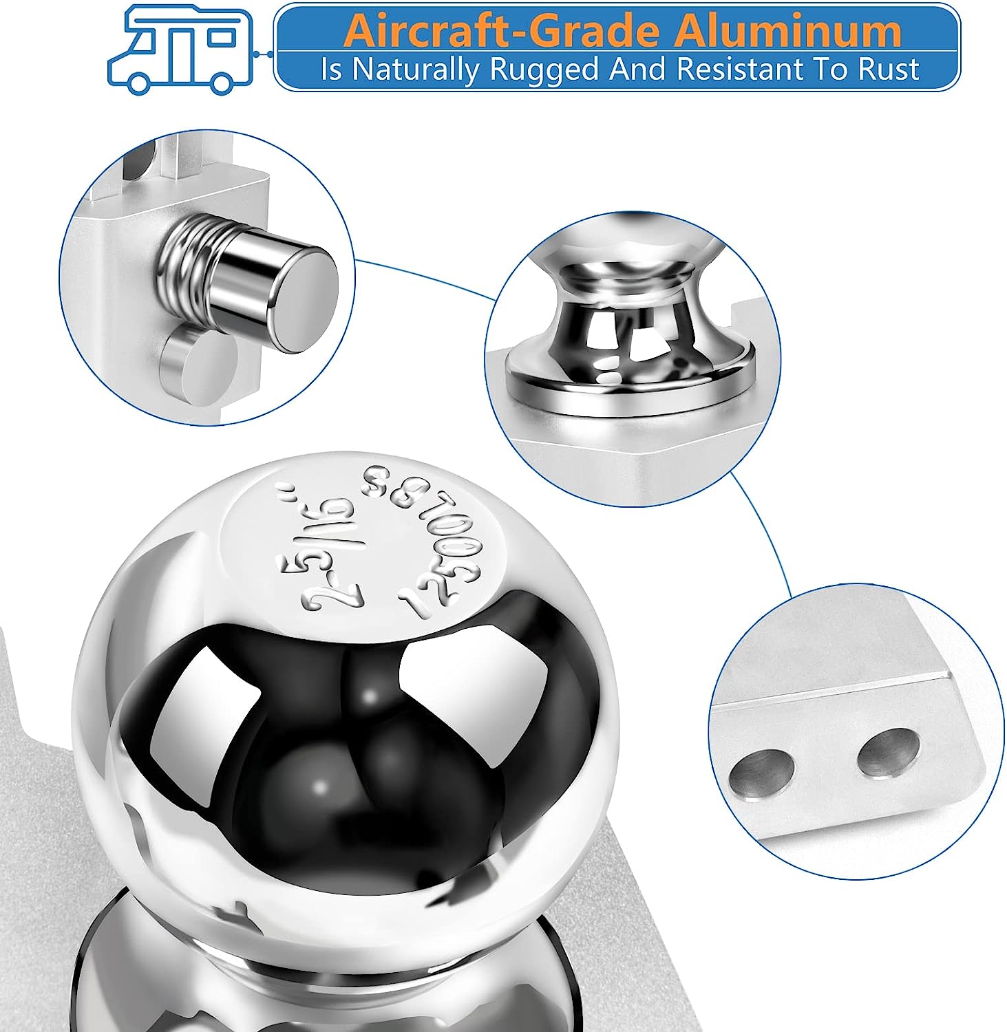 • 🛻 PEAK PERFORMANCE: Trailer hitches are made of Aircraft Grade Aluminum-magnesium alloy & Stainless steel ball, smooth and firm, with special corrosion resistance and effective resistance to rain, snow and other adverse weather. Rest assured the product is manufactured with the finest materials and durable structures. The Matte aluminum frame won't rust, crack or flake off.