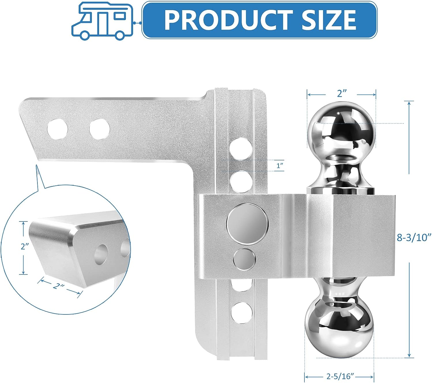 Adjustable Trailer Hitch - Tlvuvmo 6 Inch Drop Hitch for 2 Inch Receiver, Ball Mount Hitch 12,500 LBS, 2" and 2-5/16" Stainless Steel Dual Balls, Aluminum Tow Hitch with Double Anti-Theft Pins Locks