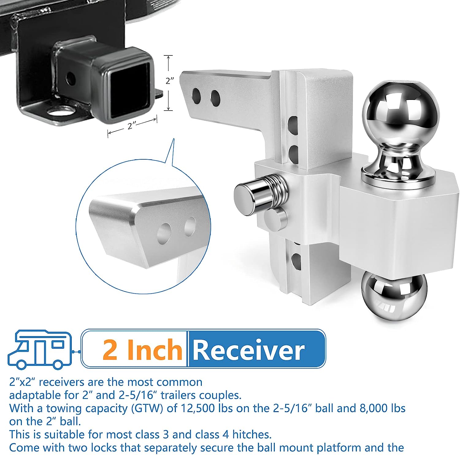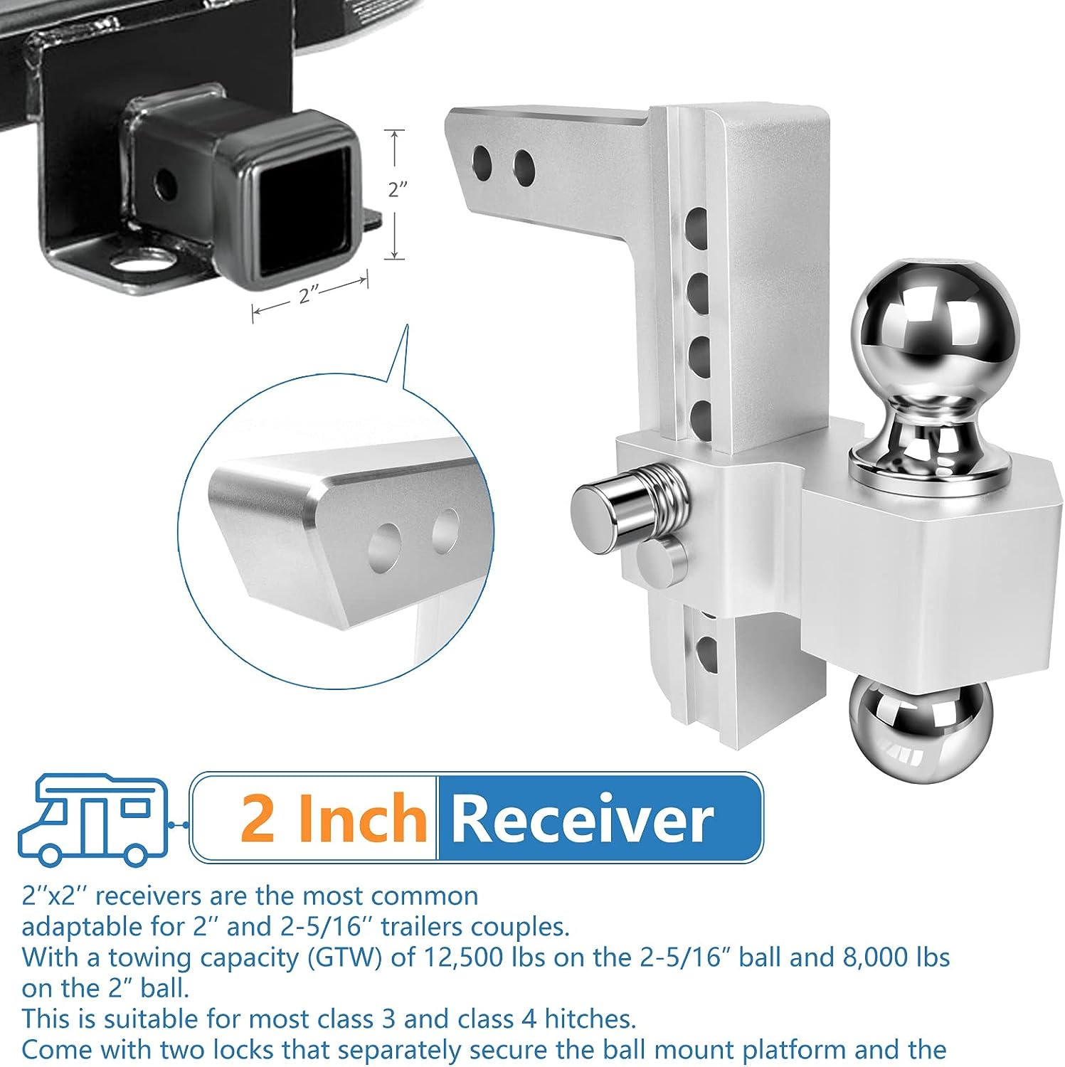 • 🛻 STRONG PULLING FORCE: 2" hitch ball has towing capacity of 8,000 lbs, while 2-5/16" hitch ball offers an industry-leading towing capacity (GTW) of 12,500 lbs, and allows for a rapid 6" drop down depth and 6’’ rise height so the tow hitch can be easily adjustable for optimal towing. With no need to ever change hitches for different vehicles, you never have to worry about having a wrong drop !