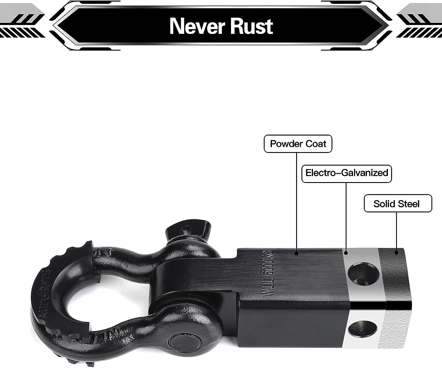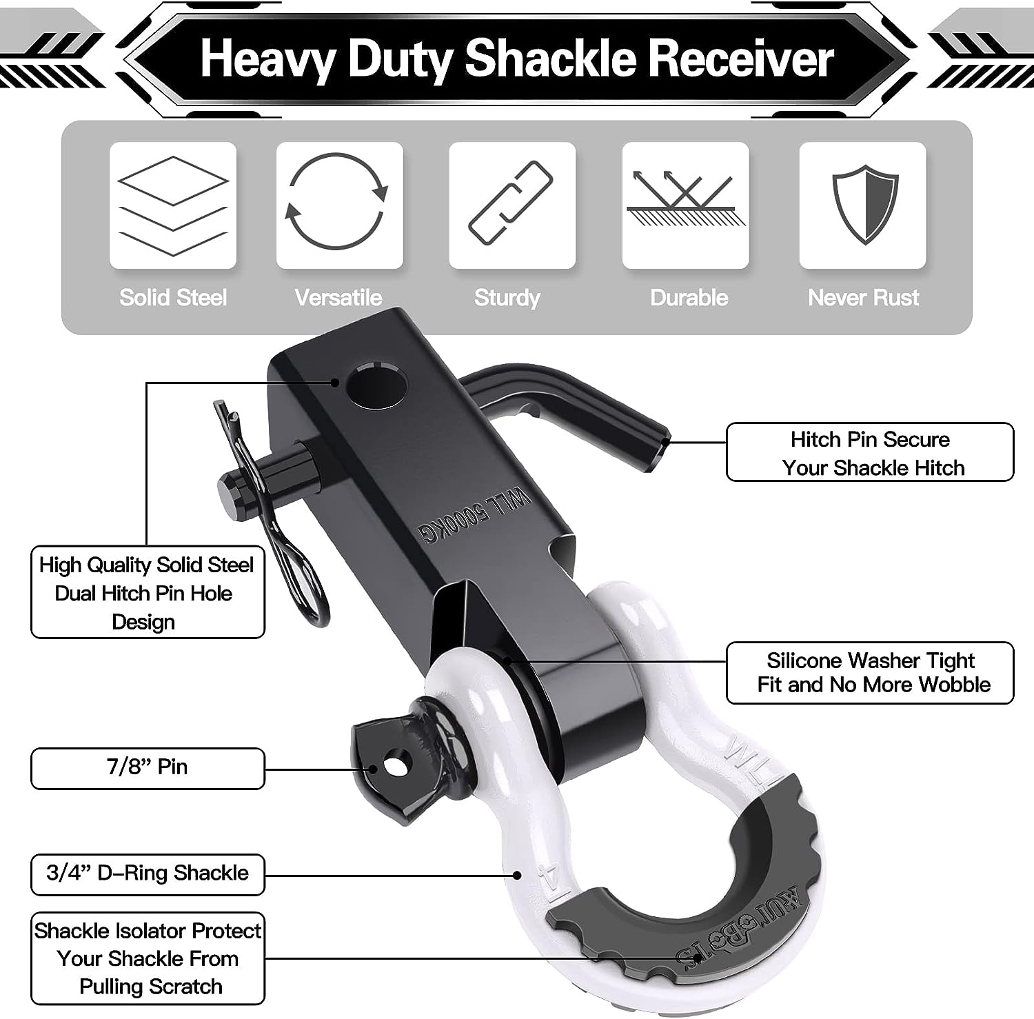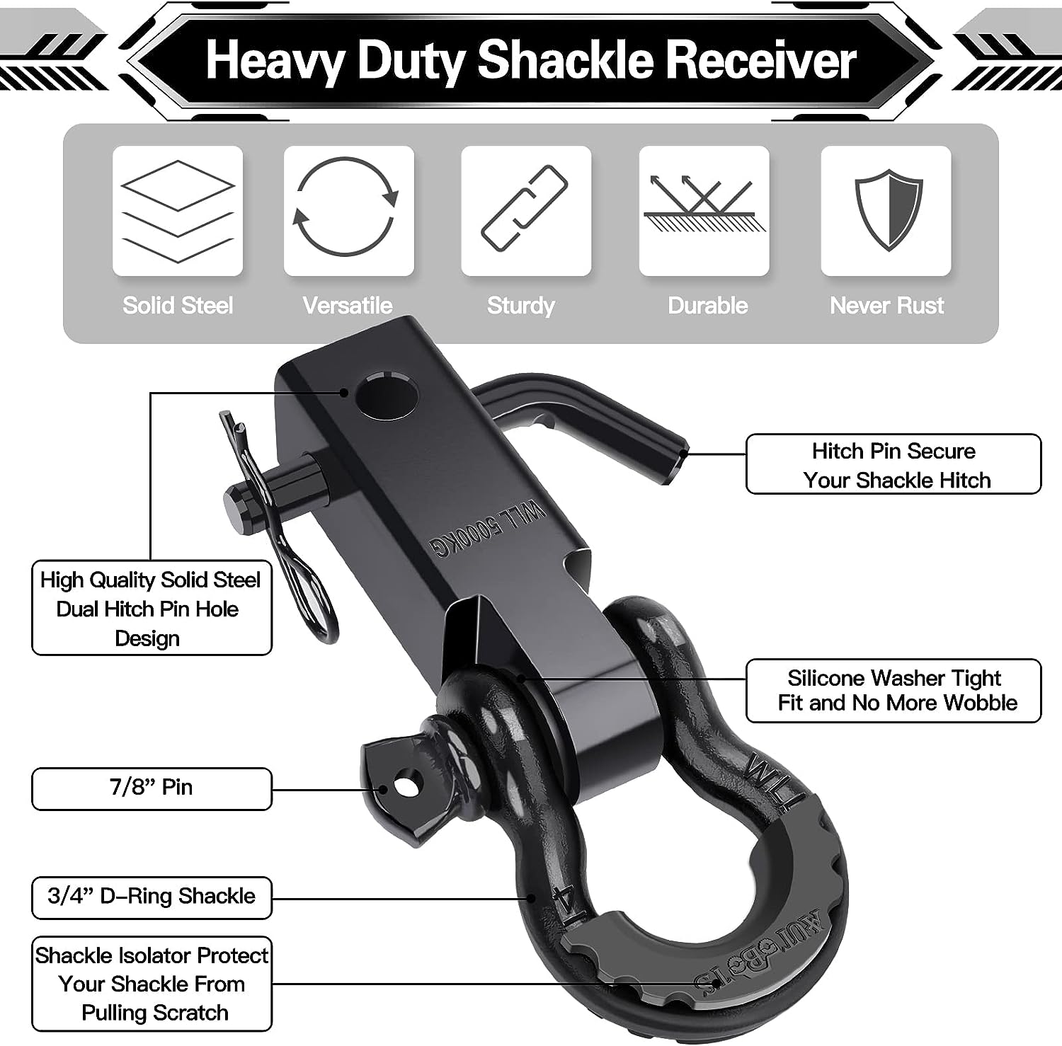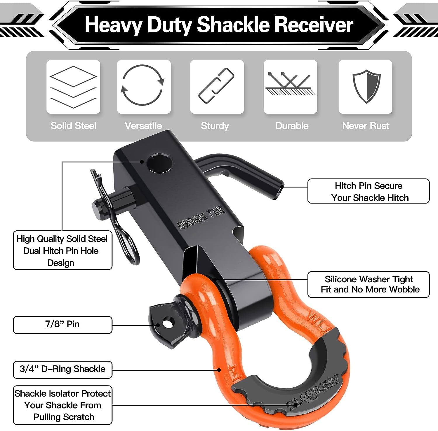 • Multiple uses: tow hitch shackle fits all standard 2" tow receivers, turning your truck, SUV or any other vehicle into a towing machine built to resist any kind of harsh conditions. The rugged powder-coated finish provides superior corrosion resistance