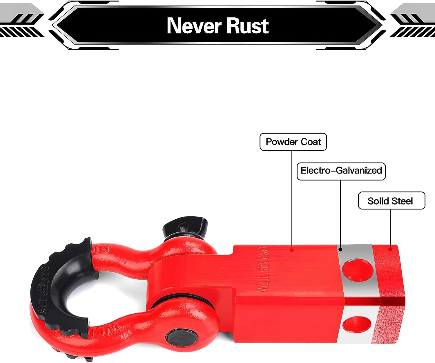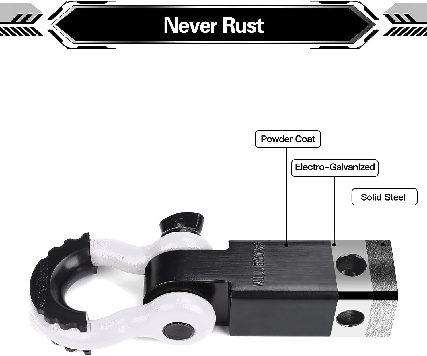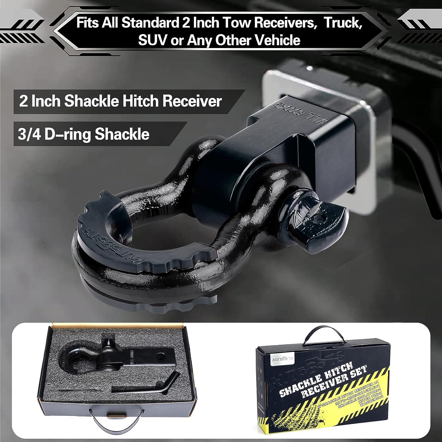 • Multiple uses: tow hitch shackle fits all standard 2" tow receivers, turning your truck, SUV or any other vehicle into a towing machine built to resist any kind of harsh conditions. The rugged powder-coated finish provides superior corrosion resistance