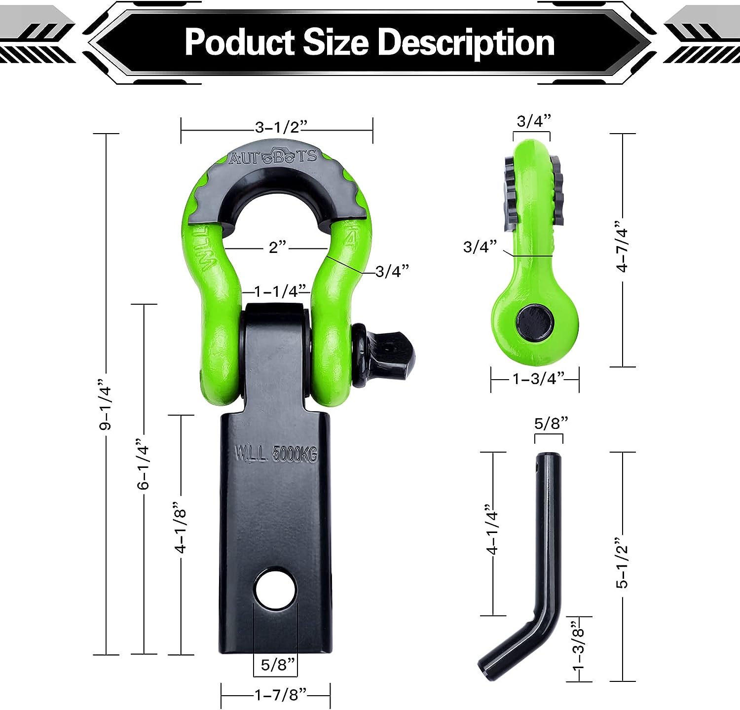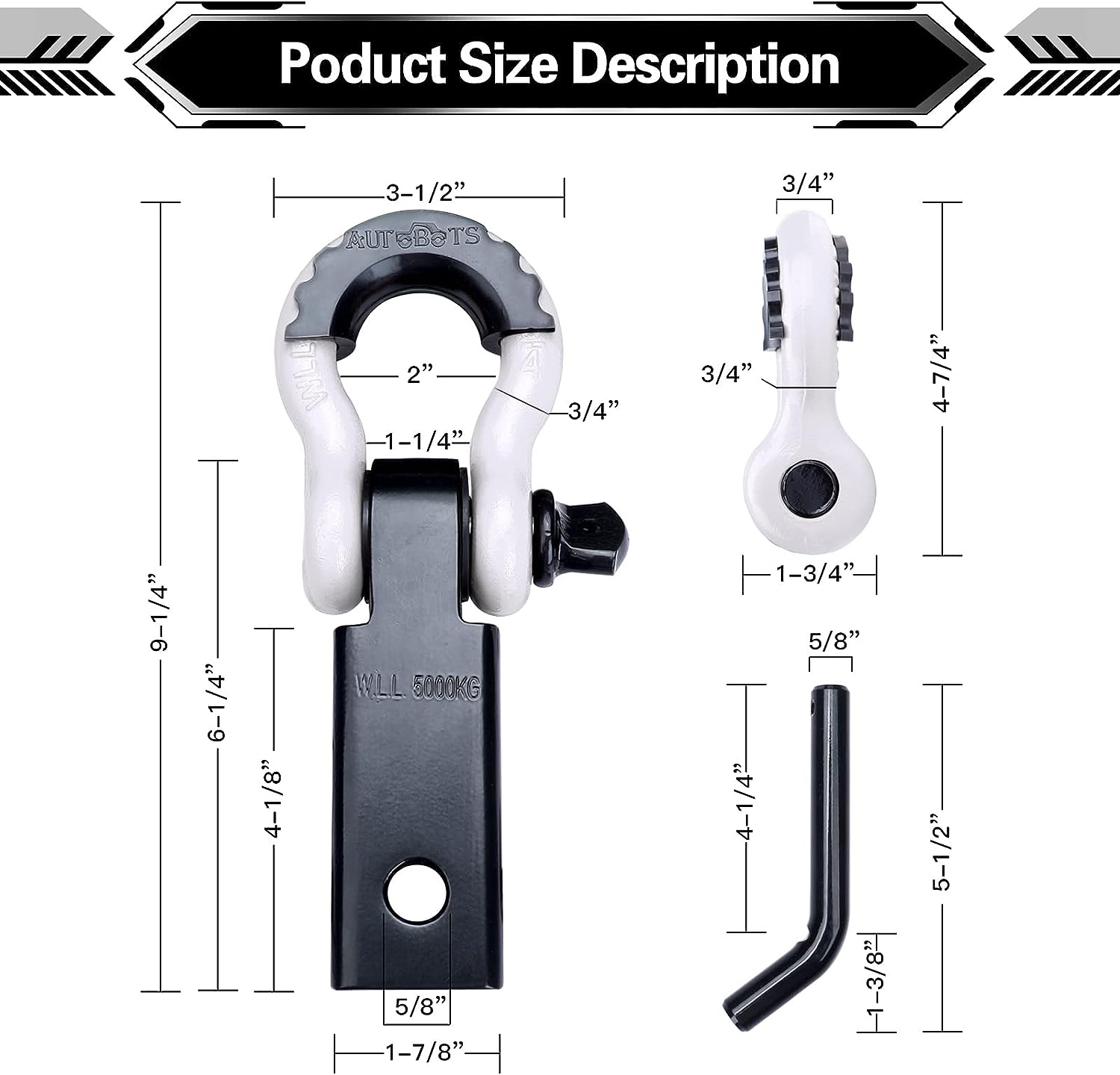 • Multi-mount design: Shackle hitch receiver with 5/8" screw pin, 3/4 shackles isolator and washer to make it more stability. Dual hitch pin hole design allows the D Rings to swing horizontally or vertically for ease of use