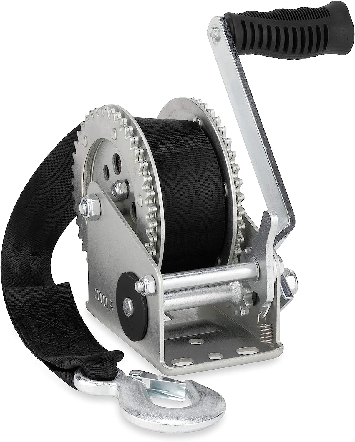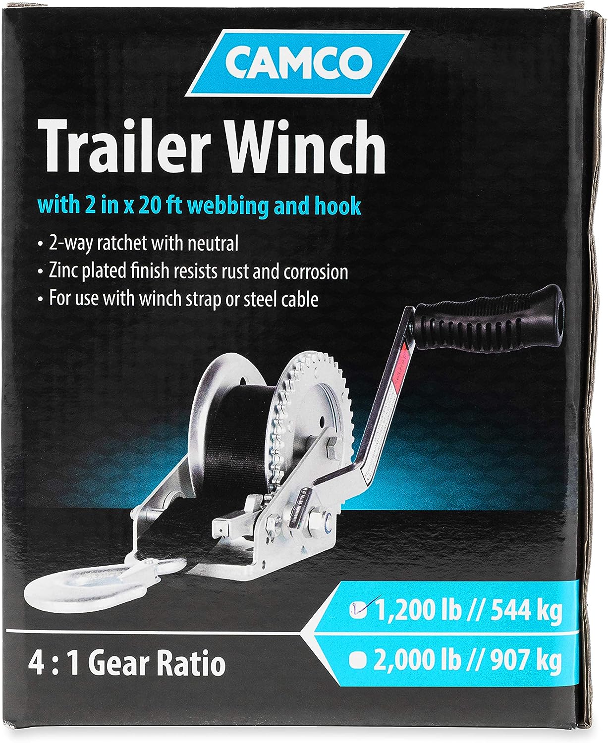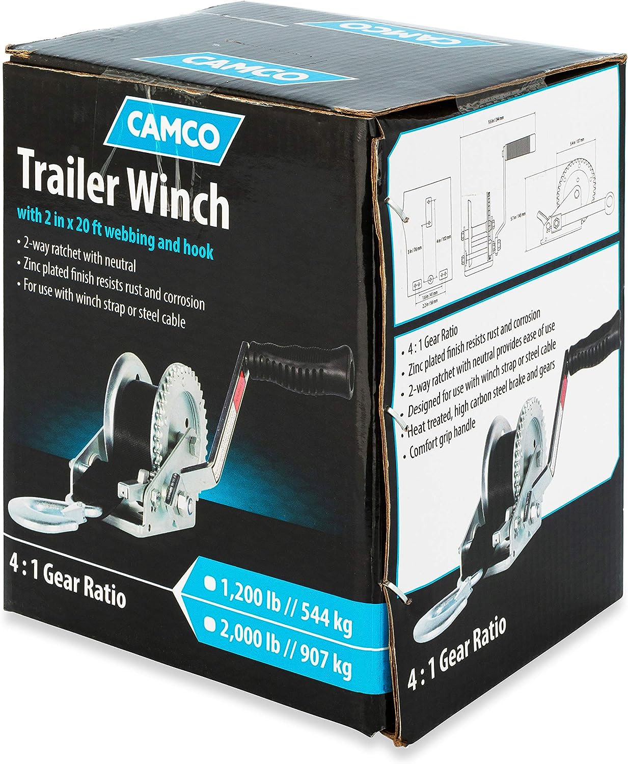 Camco's Heavy-Duty Trailer Boat Winch allows you to load your boat onto your tow trailer smoothly, safely, and accurately. The winch features a two-way ratchet with a neutral position for ease of use. It also includes a comfort grip handle for simple, comfortable cranking. The included 20-foot (L) x 2-inch (W) polyester webbing strap has a 2,000 lb. weight capacity. Its brake and 4:1 ratio gears are made of heat-treated high carbon steel; the winch is constructed of corrosion-resilient zinc-plated steel that protects against sun damage. This product includes: (1) boat crank winch, (1) 20-foot (L) x 2-inch (W) polyester webbing strap, and (1) snap hook.