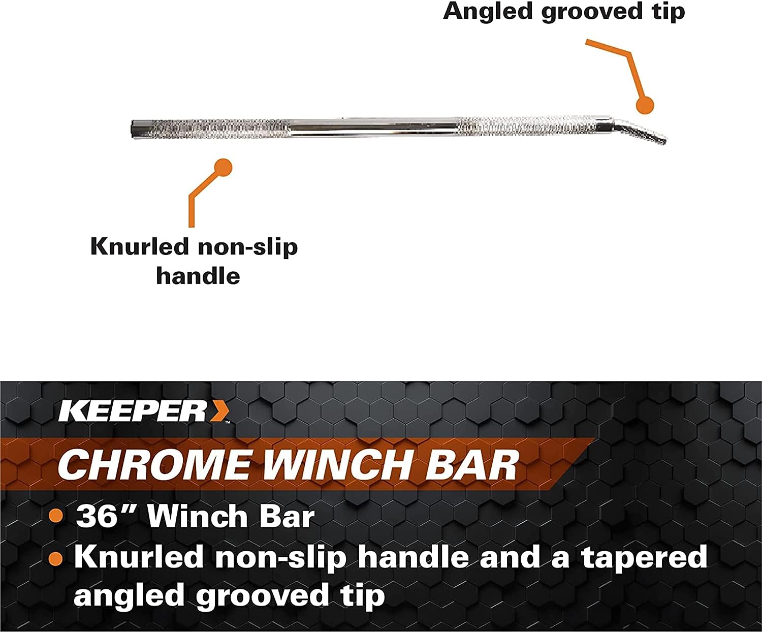 The Keeper Chrome Winch Bar can be used with a bolt on or weld style Deep Storage Winch. Winch bars are tapered and angled at the end for easy use, the tip is grooved to make it easy to grip the winch. Winch bars also can be used to release chain load binders and tension winches. Our winch bar also features a knurled, non-slip handle for secure operation. Length: 36" Finish: Chrome Can be used with a bolt on or weld on style deep storage winch Tapered & angled at the end for easy use, the tip is grooved to make it easy to grip Can be used to release chain load binders & tension winches, has a knurled Non-slip handle for secure operation Can be used with model #04928 Weld mount trailer winch.