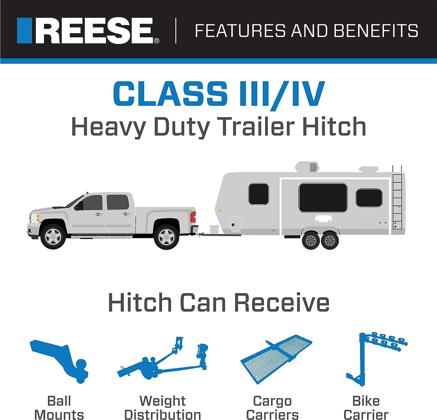 Reese Towpower custom built trailer hitches feature solid all-welded construction for maximum strength and safety! Computer aided design, fatigue and stress testing insure a robust design that provides a lifetime of trouble free towing. Each hitch is engineered and "Tested Tough" to deliver the absolute highest quality trailer hitch available anywhere! Looks great and work great with our full line of hitch accessories (sold separately), including our exclusive InterLock hitch ball and ball mount "One Wrench Tightening System"! All of our hitches meet and exceed V-5, CSA and SAE J684 standards and are inspected for quality and workmanship! Designed for a perfect fit and a great look, with many no drill applications for quick and easy DIY installation. The METALSHIELD protective coating process is a three step finish consisting of a rust inhibiting primer, dipped E-coat electrostatic coating to insure total finish coverage and finally an outer powder coat finish for durability. The METALSHIELD process is an OEM compatible finish providing the best corrosion protection over brands that use only powder coat on their products. All our hitches are custom built according to exact manufacturer and model year specifications and test fitted to ensure a perfect fit, ease of installation and superior towing performance.