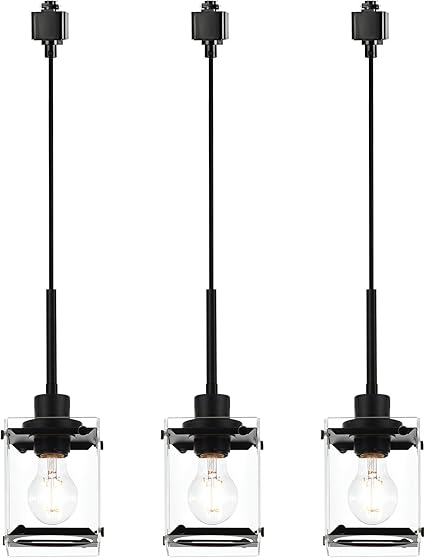 3-Pack Track Pendant Light Restaurant Adjustable Height Track Light, Black Farmhouse Kitchen Lamp with Clear Glass Shape Pendant Lamp Decorative Track Lighting Fixture for Hallway bar