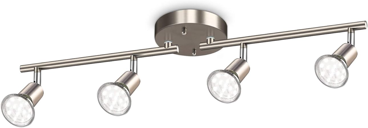 Ascher 4-Light LED Track Lighting Kit, Flexibly Rotatable Light Heads, 4 Way Ceiling Spotlight Matt Nickel Finish, Including 4 GU10 LED Bulbs (4W 400LM Daylight White 5000K)