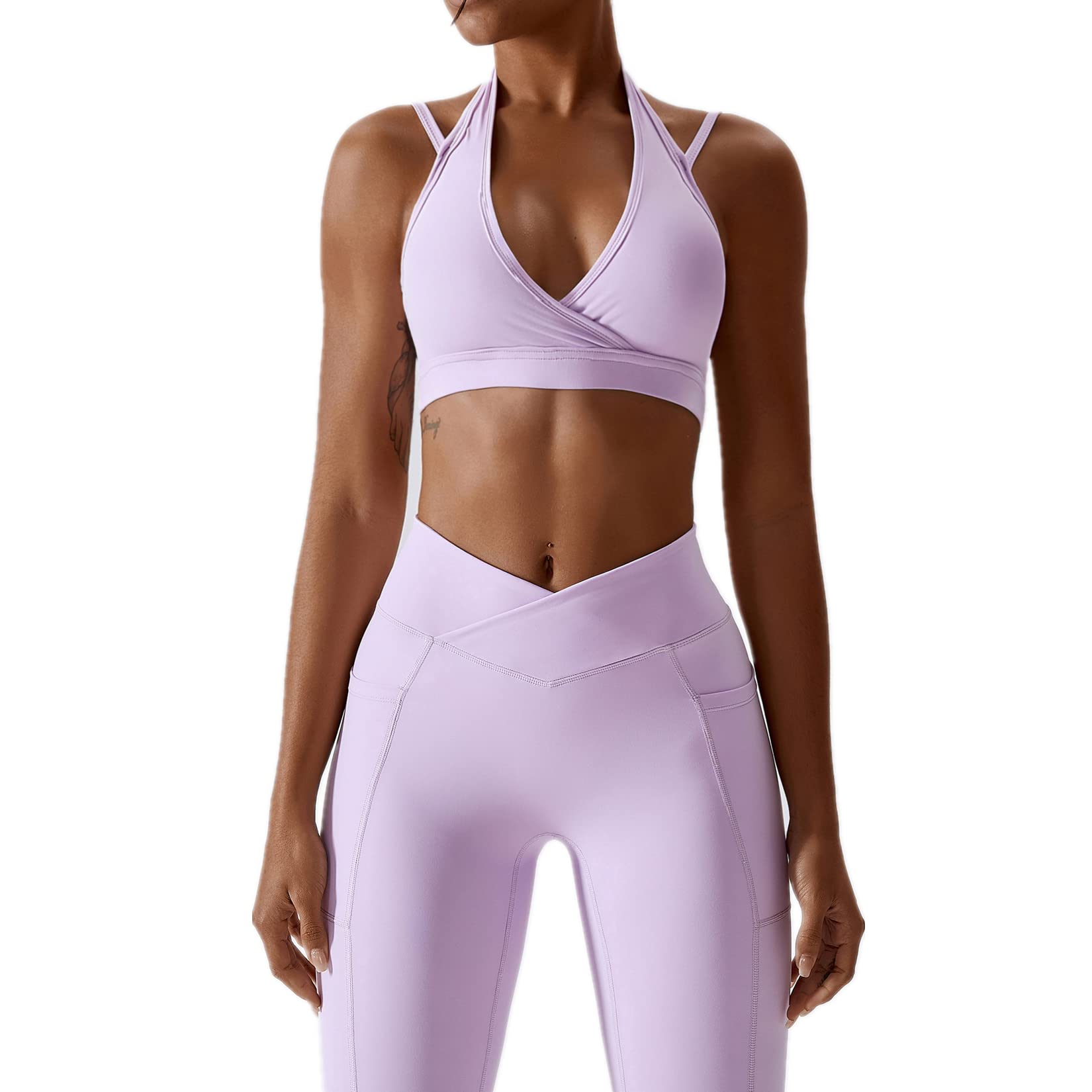 Details: ❤ ❤Women Buttery Soft Workout Sets Strappy Halter V Neck Sport Bra High Waist Leggings with Pocket 2 Piece Outfits❤ ❤