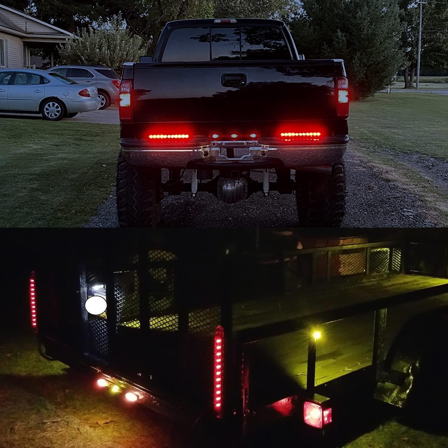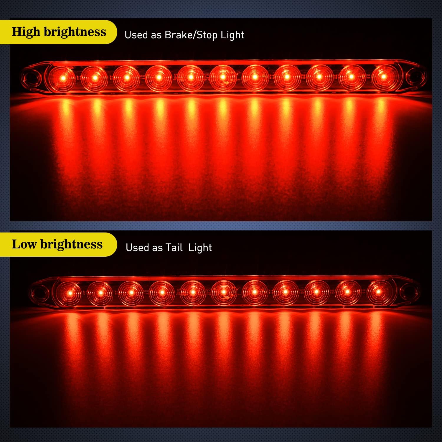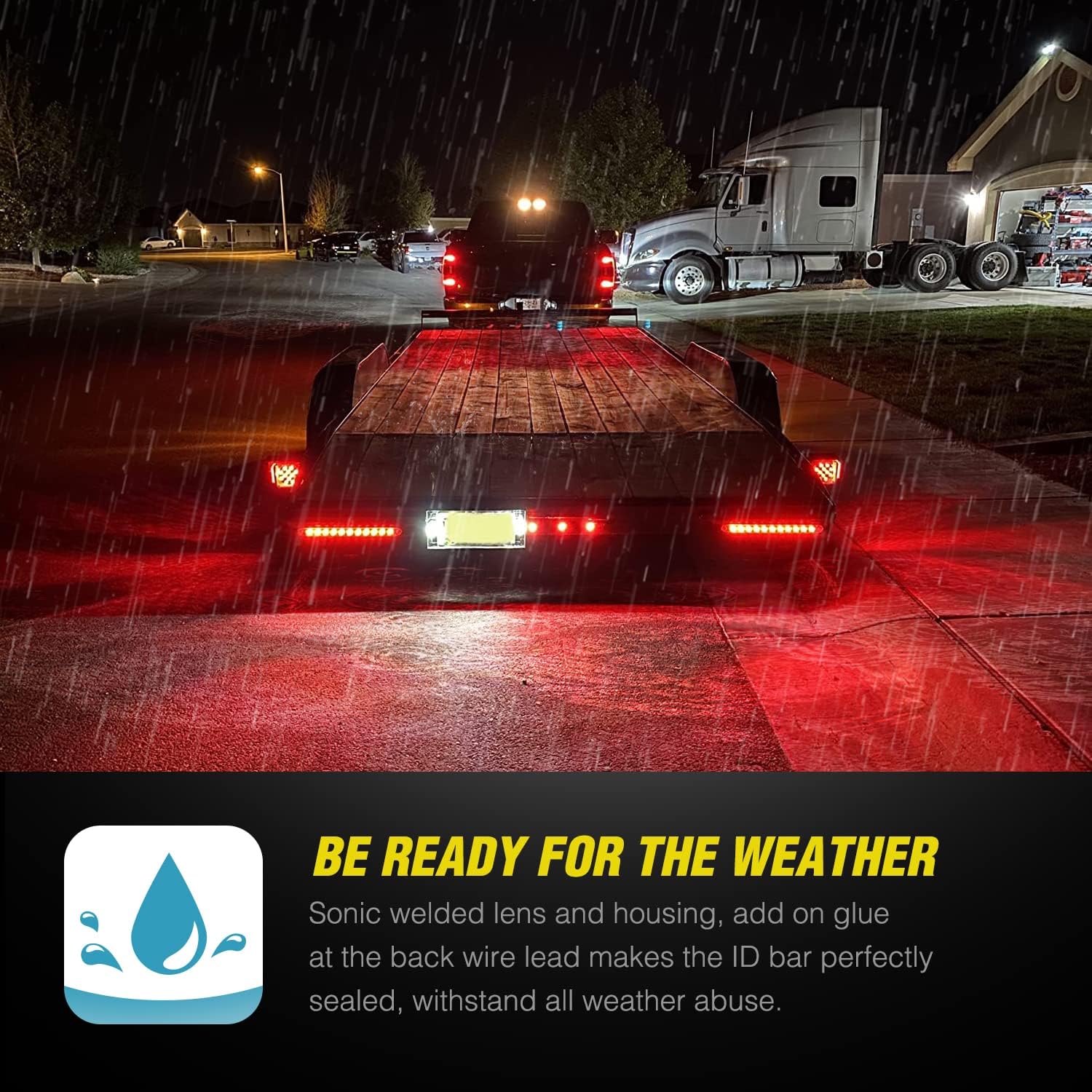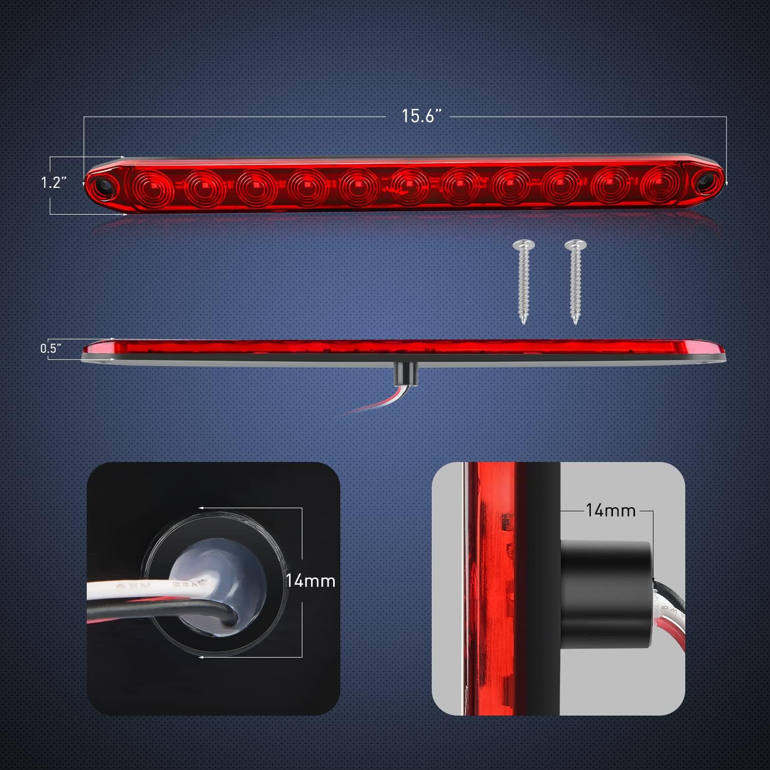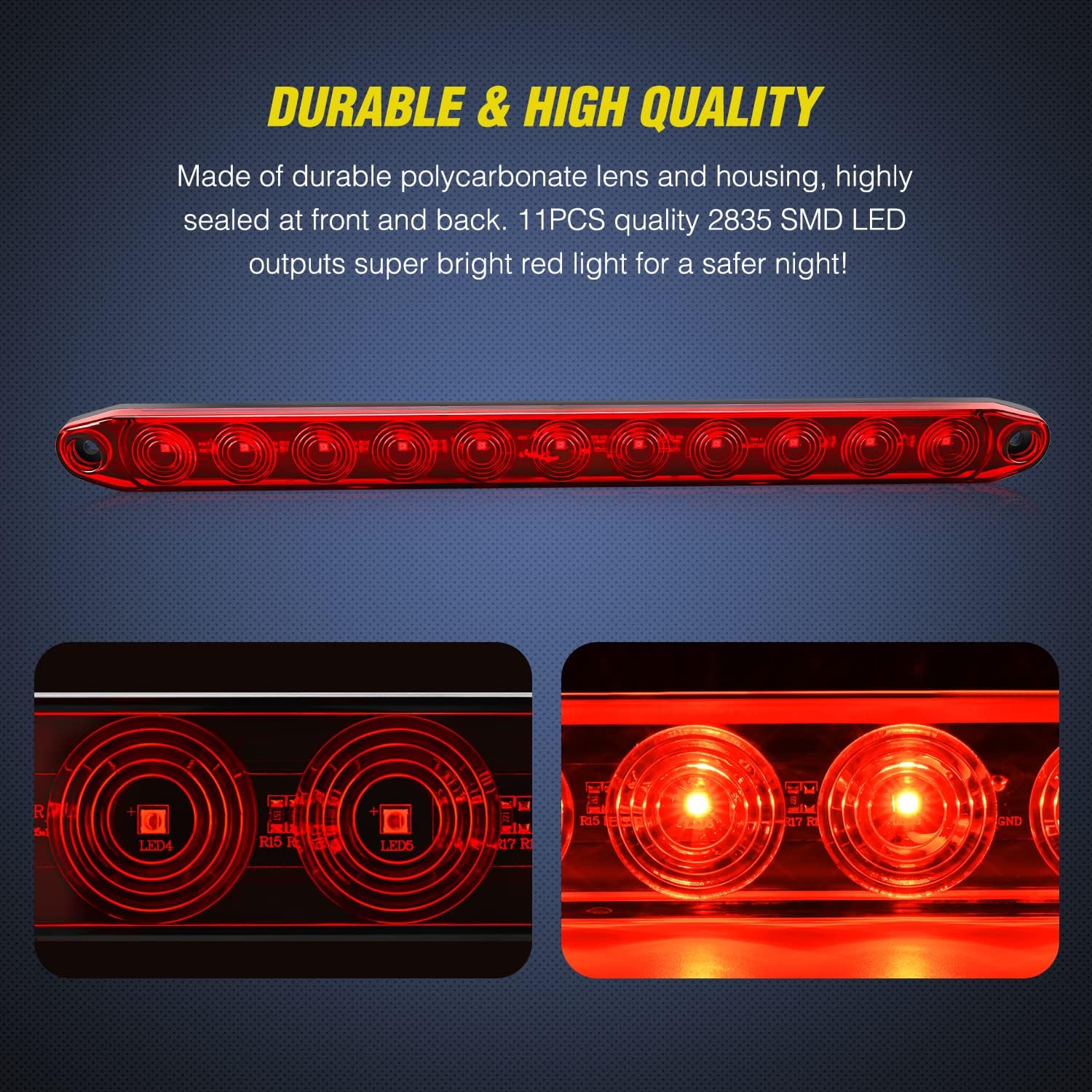 Nilight 2PCS 16” 11 LED Red Trailer Light Bar Ideal application for any wide or narrow overland vehicle requiring quality DOT compliant lighting Dimensions 15 6" x 1 2" x 0 5" Center Hole Size 14mm x 14mm Working Voltage 12V LED Type 11PCS 2835 SMD LED for each light Wire Lead 22 gauge 10inch length Material Polycarbonate lens and housing IP65 waterproof rate DOT compliant Package Includes 2 x 16 inch 11 LED Trailer Marker ID Bar 2 x Hardware Pack.