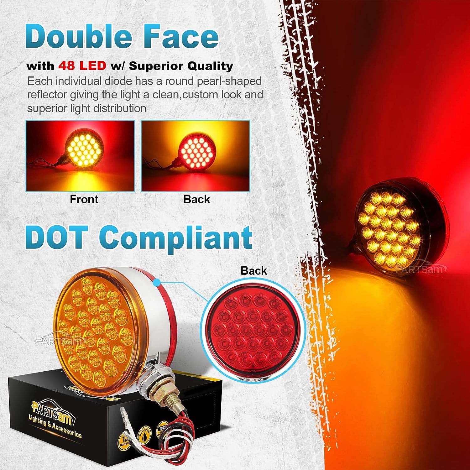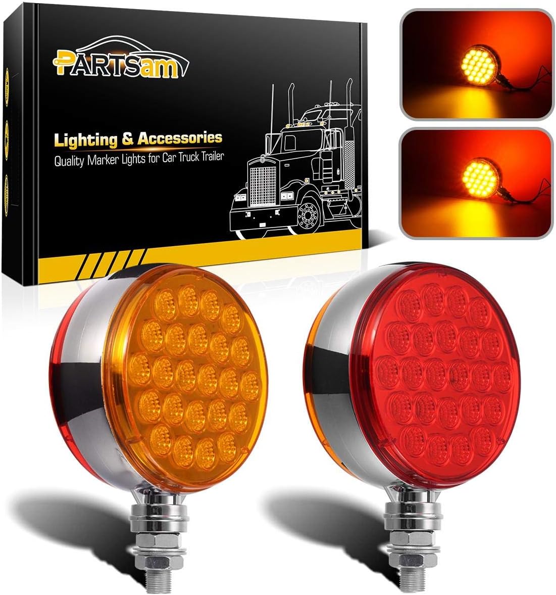 Partsam 2pc 4" Round Double Face Single Stud Mount Pearl Red/Amber 48 LED Pedestal Fender Reflective Lights w Chrome Housing Sealed Replacement for Kenworth/Peterbilt/Freightliner DOT Compliant