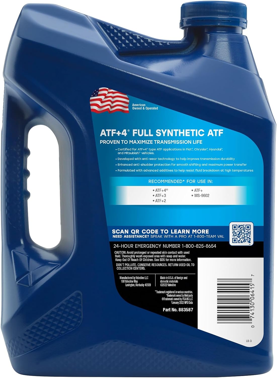 Valvoline™ ATF+4® is a full-synthetic transmission fluid specifically engineered to protect and prolong the life of (FCA) Fiat Chrysler automatic transmissions. It is officially licensed and approved by FCA and is fully back-serviceable and can be used wherever ATF+3, ATF+2 or ATF+ is specified. Recommended for use in the following applications: Mopar ATF+ MS 7176®, ATF+2® MS 7176, ATF+3™ and ATF+4™.