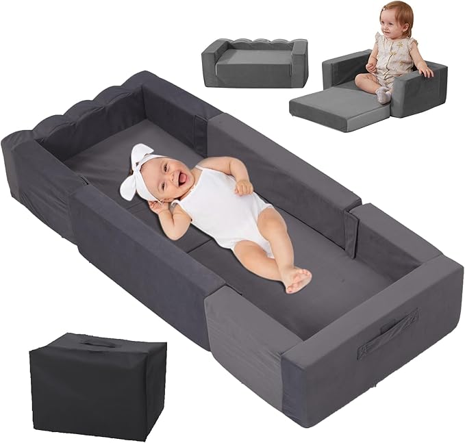 Toddler Travel Bed, Portable Foldable Toddler Bed, Raised Safety Bumpers‰_´Converts to Two Sofas, Removable Washable Chair Cover and Carrying Handle with Storage Bag (Gray)_Ü_