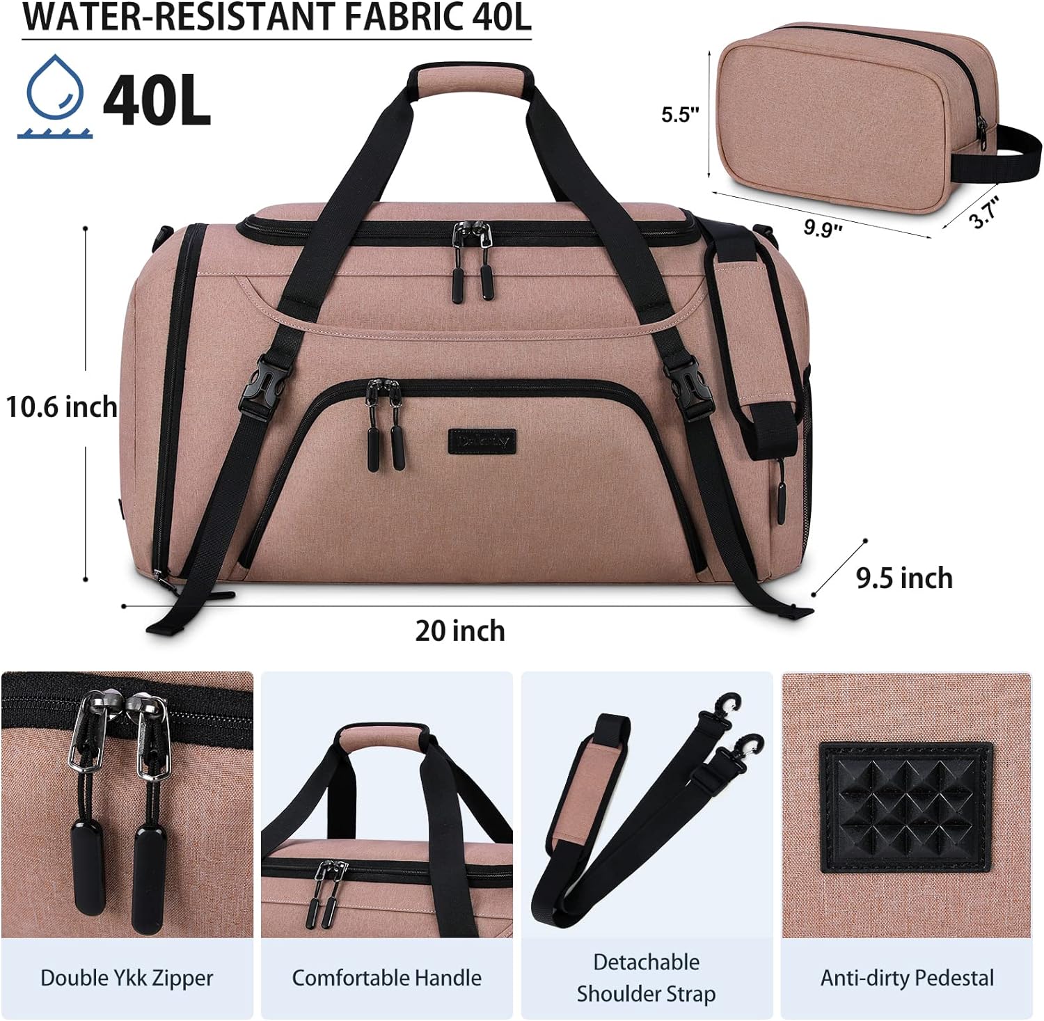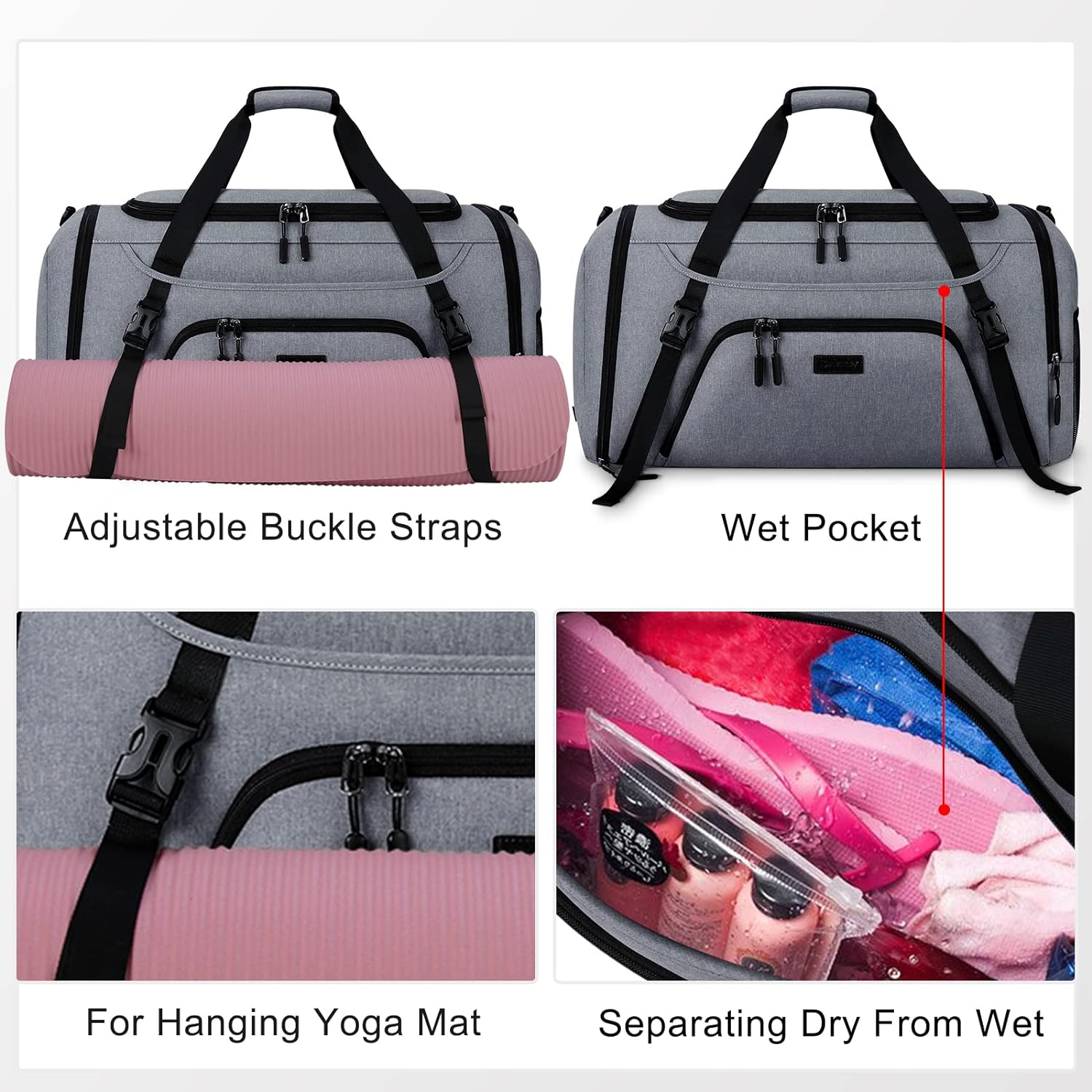 • ✔【FUNCTIONAL DESIGN】 We offers two sizes (40L/55L) travel bag.Designed with detachable and adjustable shoulder strap , it can be used as a holdall/shoulder bag/crossbody bag/sports bag/weekender bag/overnight bag, suitable for gym, pool, yoga, camping, beach, cycling or weekend trips.In addition,the extra front adjustable buckle straps can hold your yoga mat of any size.Also,the back luggage belt could help you to free your hand and back.
