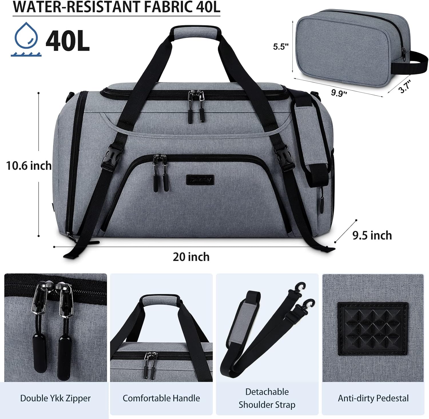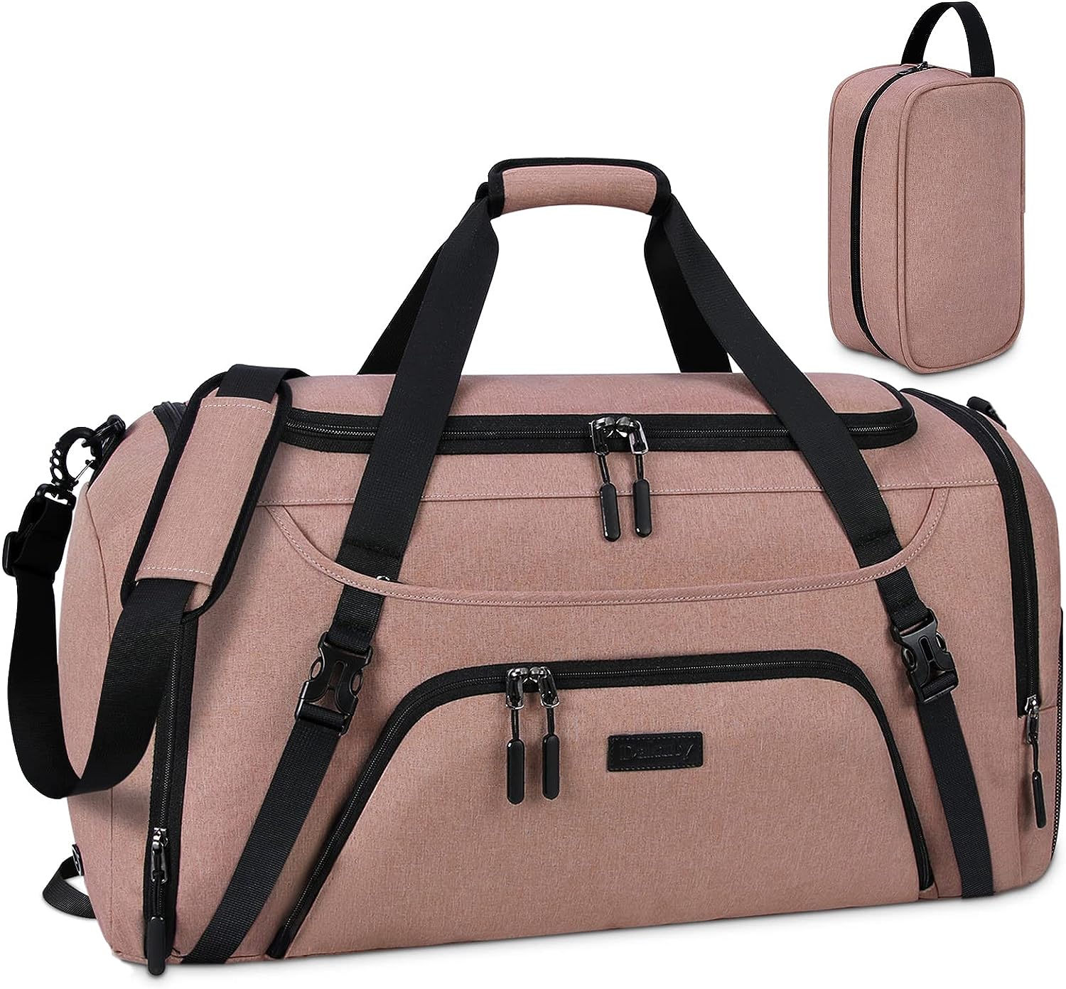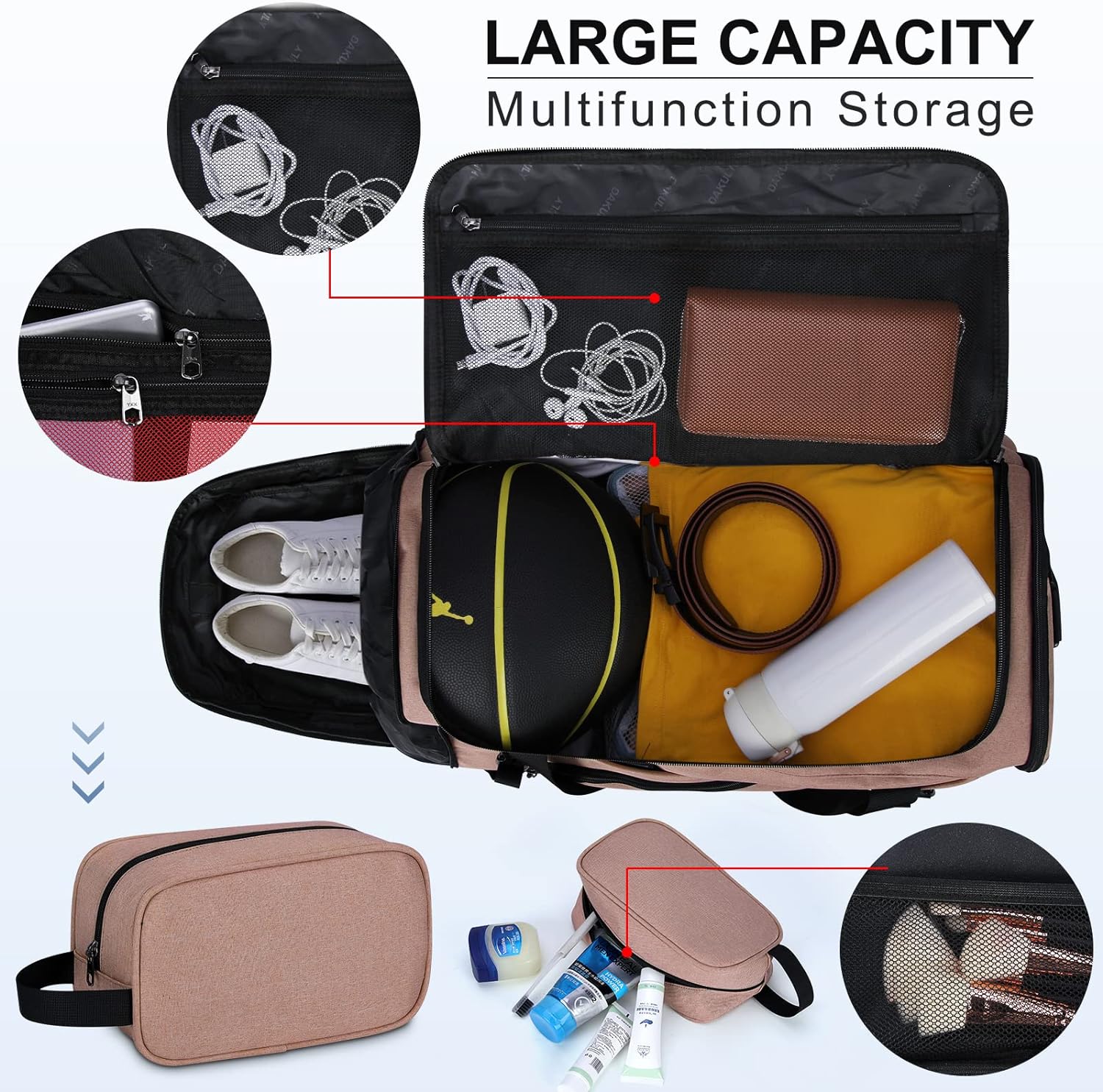 • ✔ 【SPACIOUS STRUCTURE】Spacious in design,Dakuly duffel bag has 12 pockets to organize all your stuff, including 1 enormous main compartment with double zippers to keep all your belongings, 2 inside zipper pockets, 1 front pockets with 2 slot pockets, 2 pens pocket and key ring,1 wet pocket, 1 side pocket with a extra outside mesh pocket and 1 shoe compartment.