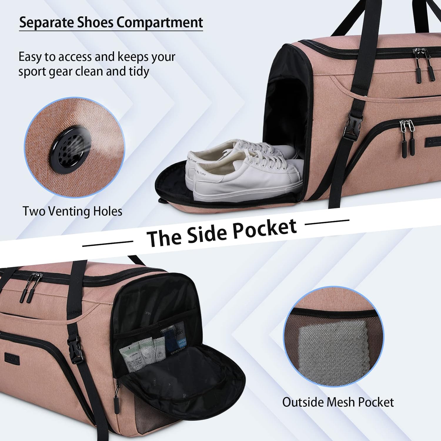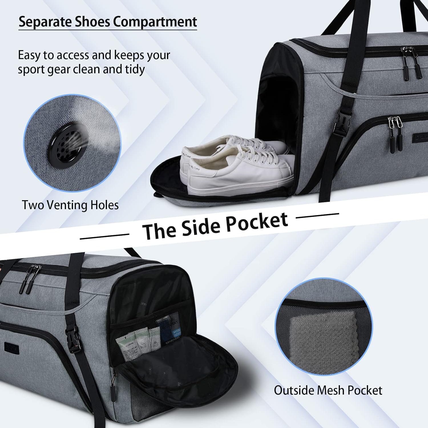• ✔ 【SHOES COMPARTMENT & WET POCKET】Gym duffle bag is designed with separate shoes compartment which fits most sizes of shoes . With two vents and external zippers, it separates dirty shoes from clean clothes, solving the trouble of odor and keep you organized in your sporting or traveling. The wet pocket is zipper closed for storing wet clothes, towels, umbrellas, toiletries or cold drinks, separating dry from wet, more over avoiding leakage.