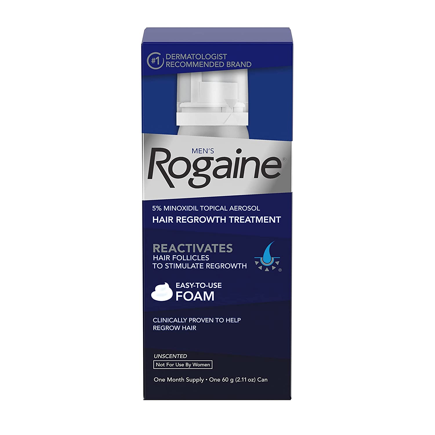 Help treat hair loss and regrow fuller hair with Men's Rogaine 5% Minoxidil Topical Foam. Ideal for use at the early stages of hair thinning, this hair regrowth treatment is clinically proven to regrow up to 25% more hair in 12 weeks. Unlike hair loss shampoos and hair thickening products that temporarily plump hair from the outside, Rogaine penetrates the scalp to reactivate shrunken hair follicles, allowing for regrowth of hair. The 5% Minoxidil formula works to boost hair follicle activity and hair protein production, while Tricho-Prime Technology uses a proprietary combination of ingredients to create an optimal environment for hair regrowth. It comes in a no-mess foam that is easy to use and is designed to fit easily into your routine. Based on hair count among men and women in clinical studies performed on Jan 2006