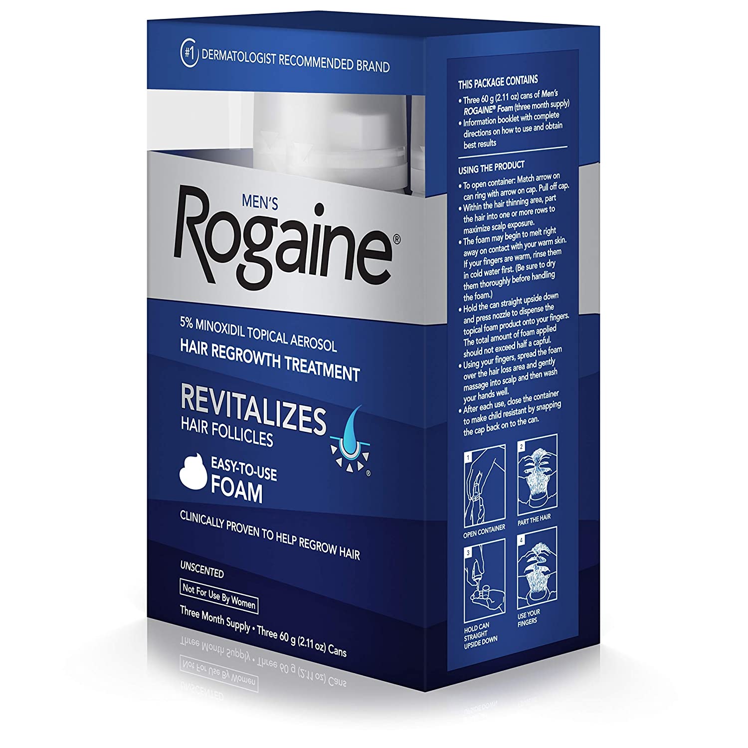 Help treat hair loss and regrow fuller hair with Men's Rogaine 5% Minoxidil Topical Foam. Ideal for use at the early stages of hair thinning, this fast-working hair regrowth treatment is clinically proven to regrow up to 25% more hair in 12 weeks. Unlike hair loss shampoos and hair thickening products that temporarily plump hair from the outside, Rogaine penetrates the scalp to reactivate shrunken hair follicles, allowing for regrowth of hair. The 5% Minoxidil formula works to boost hair follicle activity and hair protein production, while Tricho-Prime Technology uses a proprietary combination of ingredients to create an optimal environment for hair regrowth. This men's hair re- growth treatment also contains botanical extracts and emollient to help maintain a healthy, conditioned scalp, plus alphahydroxy acid (AHA) to promote natural skin exfoliation to help keep follicles open. It comes in a no-mess foam that is easy to use and is designed to fit easily into your routine.