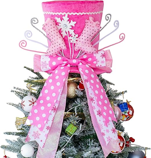 Christmas Tree Topper Hat, Xmas Tree Toppers Large Pink Hat with Lengthened Ribbon, Christmas Tree Ornaments for Christmas Holiday, Boots Snowflake, Pink D1