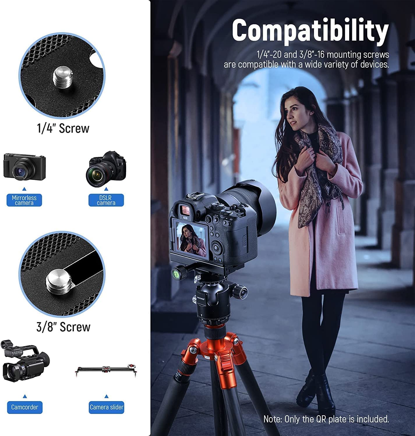 • 【Scratch-Free Mounting】 With 6 rubber pads, the quick release plate will never scratch your camera and camcorder maintaining a secure grip without slipping. The 1/4”-20 and 3/8”-16 mounting screws are compatible with a wide variety of devices