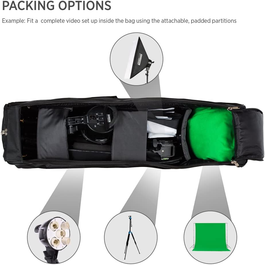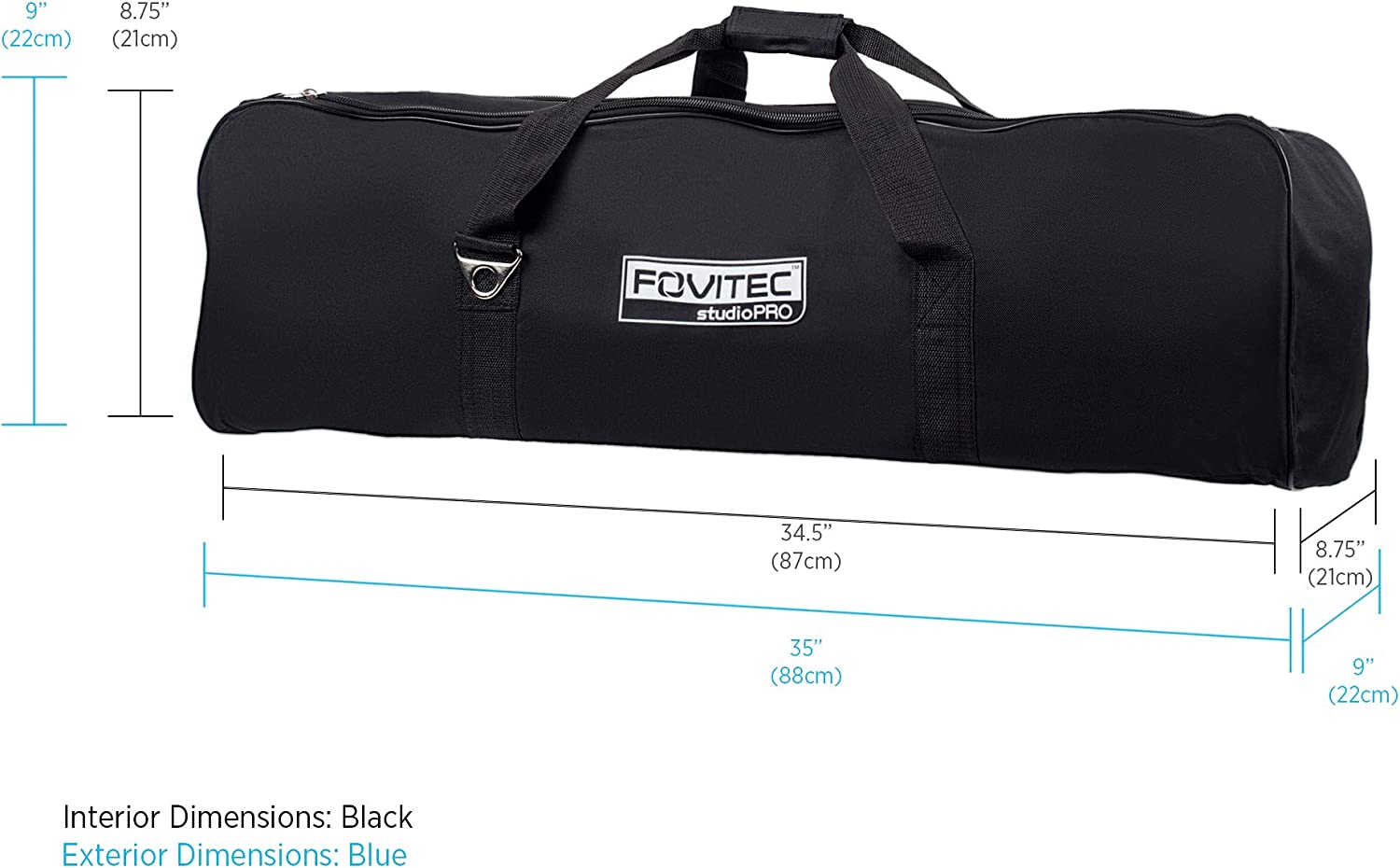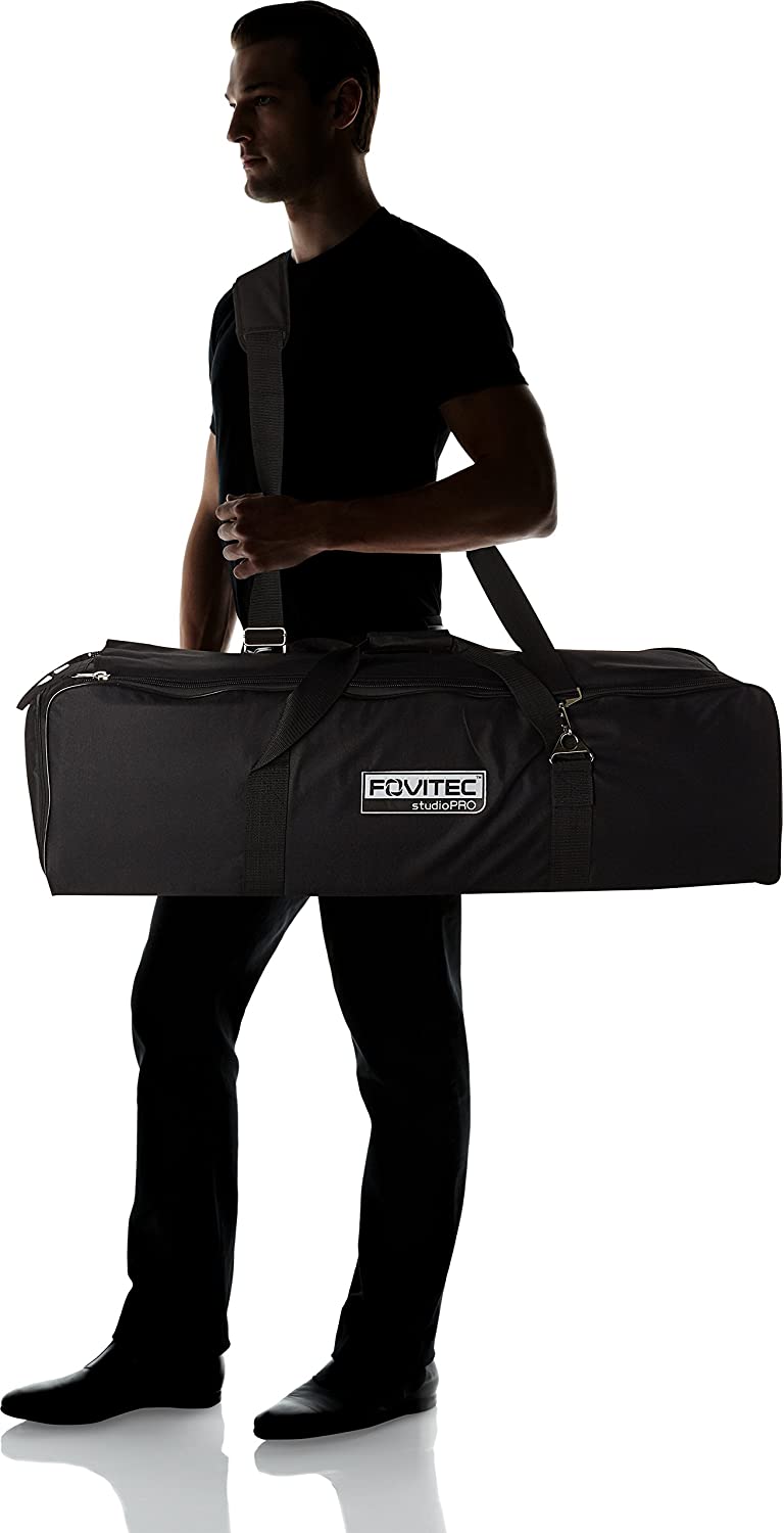 The Fovitec All in One Kit Bag is a large duffel style bag designed to carry light heads, light stands, cables and accessories. This bag is padded, and will keep all your gear safe while taking your photography or video studio on the go. The bag can be transported by carry straps with an overlapping grip or by a removable shoulder strap. It features a top opening for quick access at the top of your bag. The largest compartment can be accessed through the front of the bag, which also features a zipper pouch along the interior of the cover. Inside the bag comes with four moveable padded dividers that can be secured in place to organize your gear. Get out of the studio and get on location with this Fovitec All in One Kit Bag!
