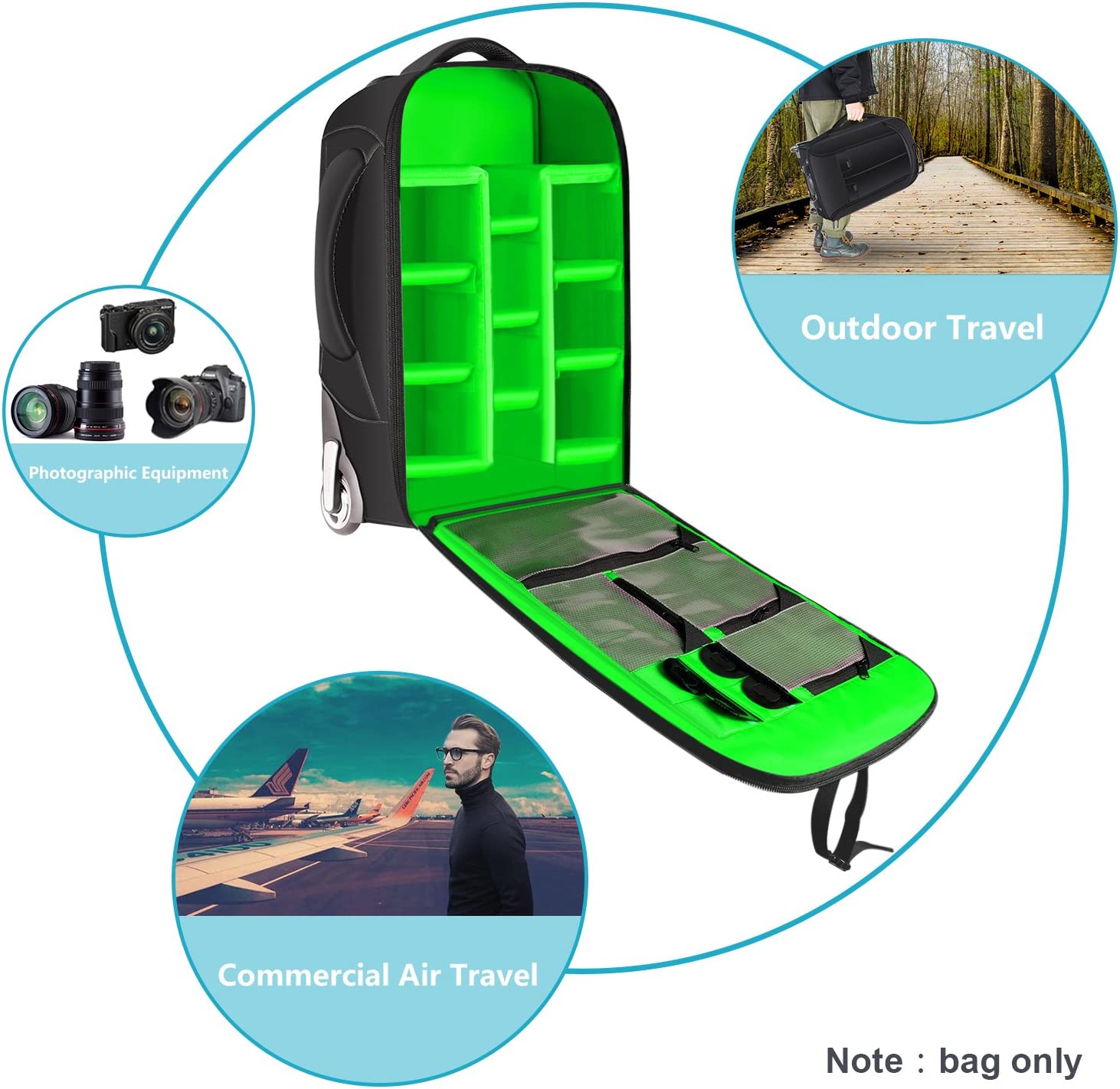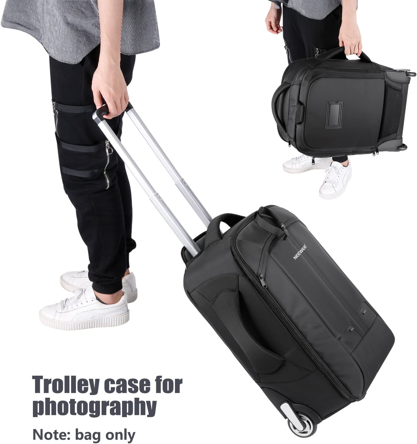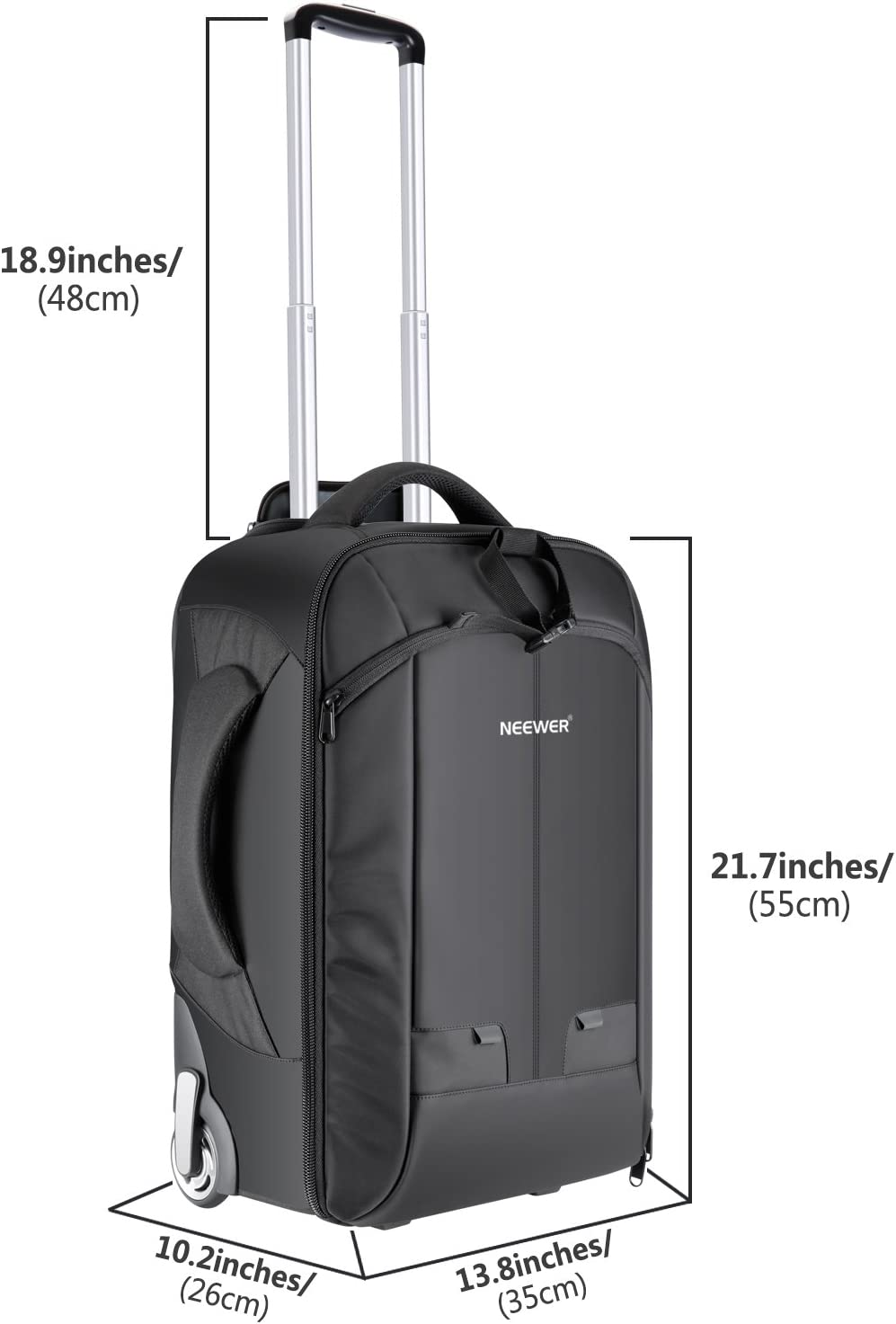 • SIZE: 13.8x10.2x21.7 inches/35x26x55 centimeters; NOTE: Considering the different requirement of boaring luggage, please check the size before purchasing; Large camera travel bag with wheels, you can quickly change it from a rolling case to a backpack; airplane carry-on compatible