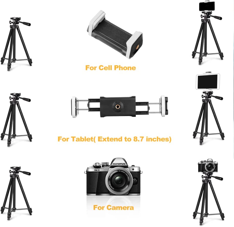 • ①【All-in-one Travel Tripod】Are you looking for a versatile tripod for your tablet, smartphone, camera? Bingo, this extendable tripod is exactly what you want. It comes with a convenient storage bag, a 2-in-1 holder which can work as tablet and phone holder. The universal 1/4 screw is included to support quickly installing the DSLR cameras.