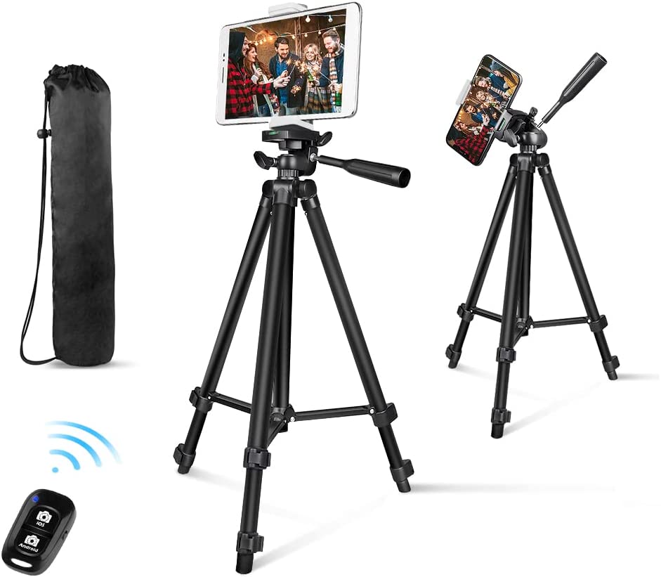 Aureday Phone Tripod, 50” Extendable Adjustable Smartphone & Tablet Tripod Stand with Phone Holder Mount & Remote, Compatible with Tablet/Cell Phone/Camera