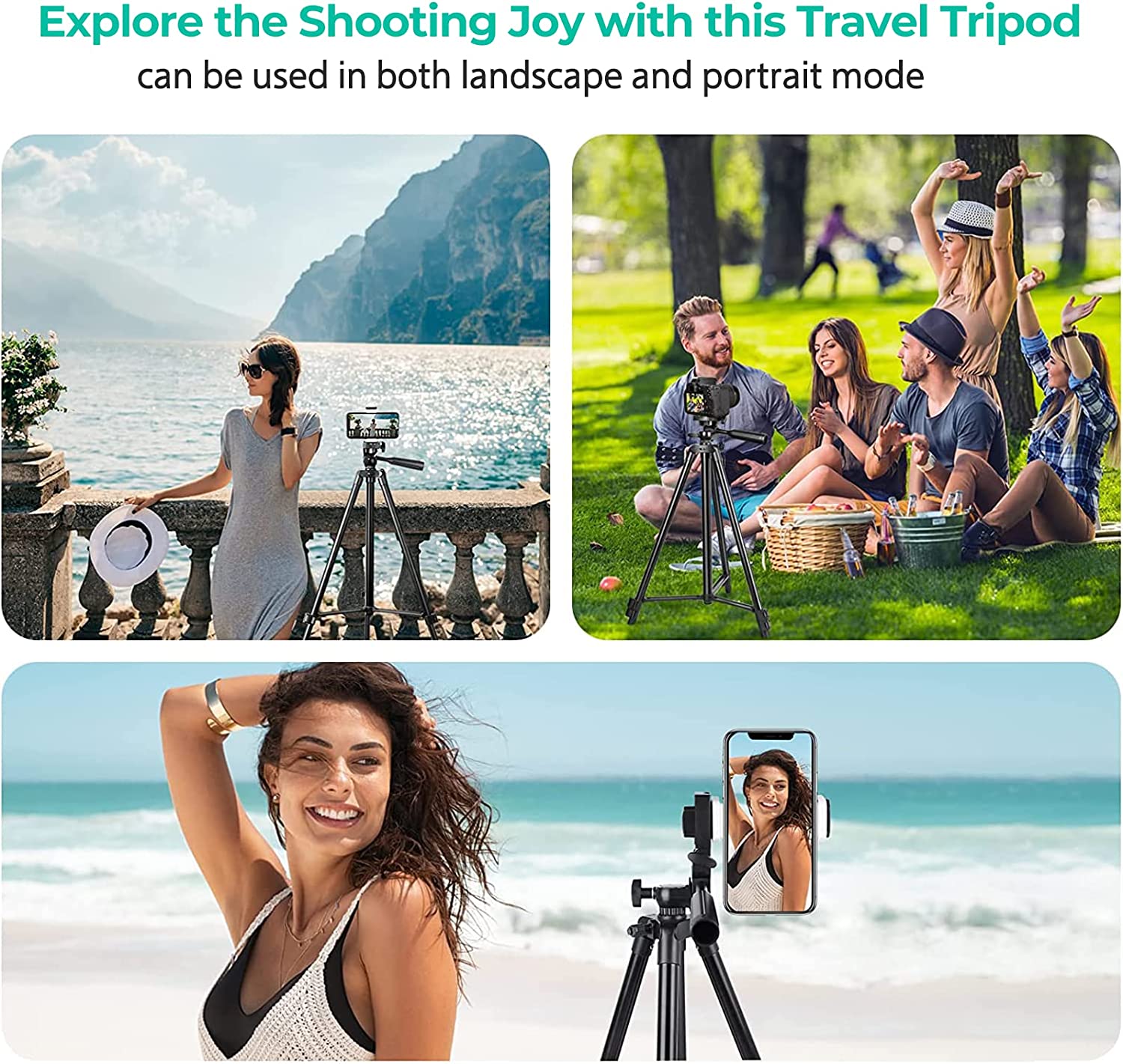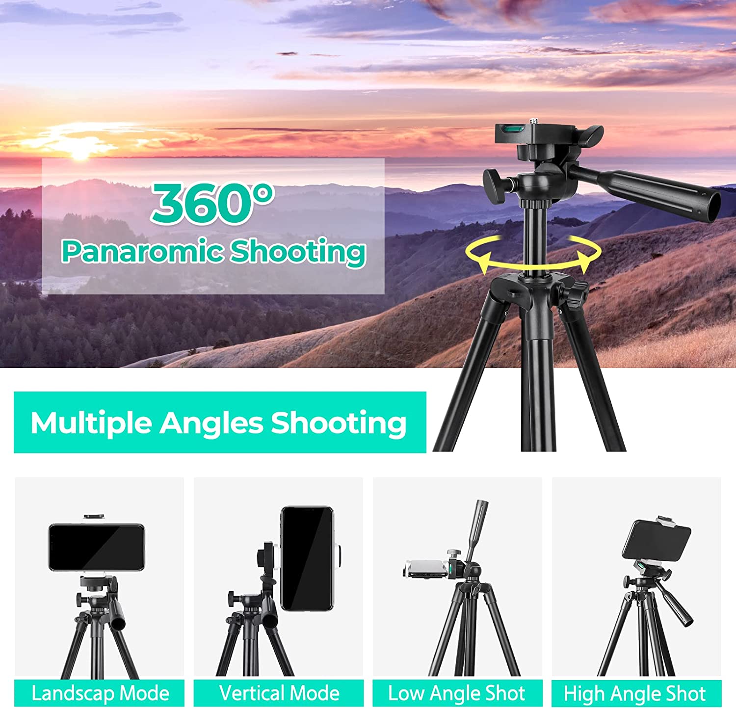 • ③【Sturdy Design】3-way pan head with 360°rotation and freely adjustable angles allows you to shoot panoramic photos/videos without limitations. Anti-skid & anti-scratch rubber feet provides stable standing and protect your cell phones from drops and damages.