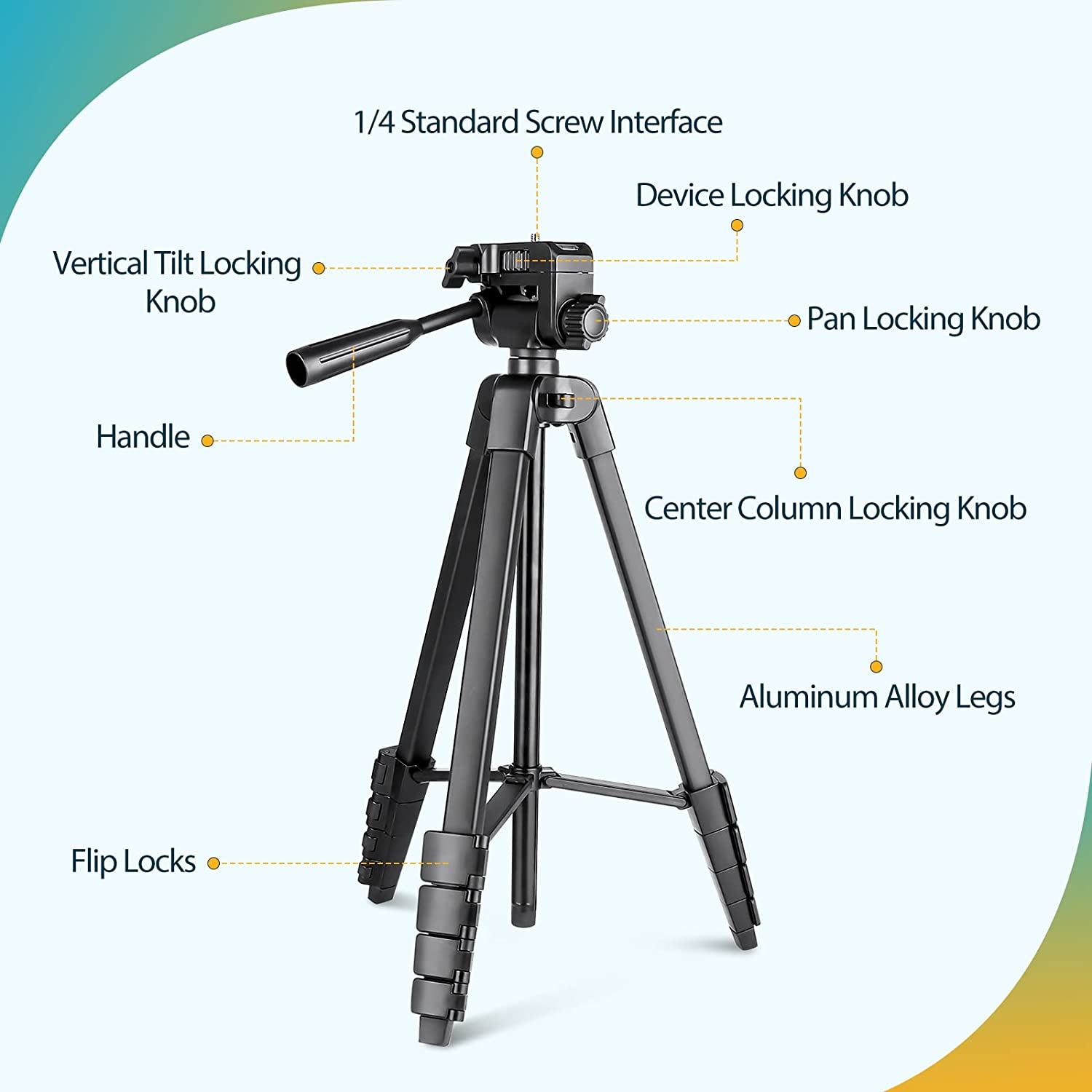 • 【Extendable Height & 3-way Pan Head】With quick flip locks on the legs, the height is freely adjustable and fully extensible from 17 inches to 64 inches. The 3-way pan head and dual built-in bubble view levels are ideal for precise framing, and the 360-degree swivel functions allow you to easily take superb panoramic shots or switch from portrait to landscape mode.