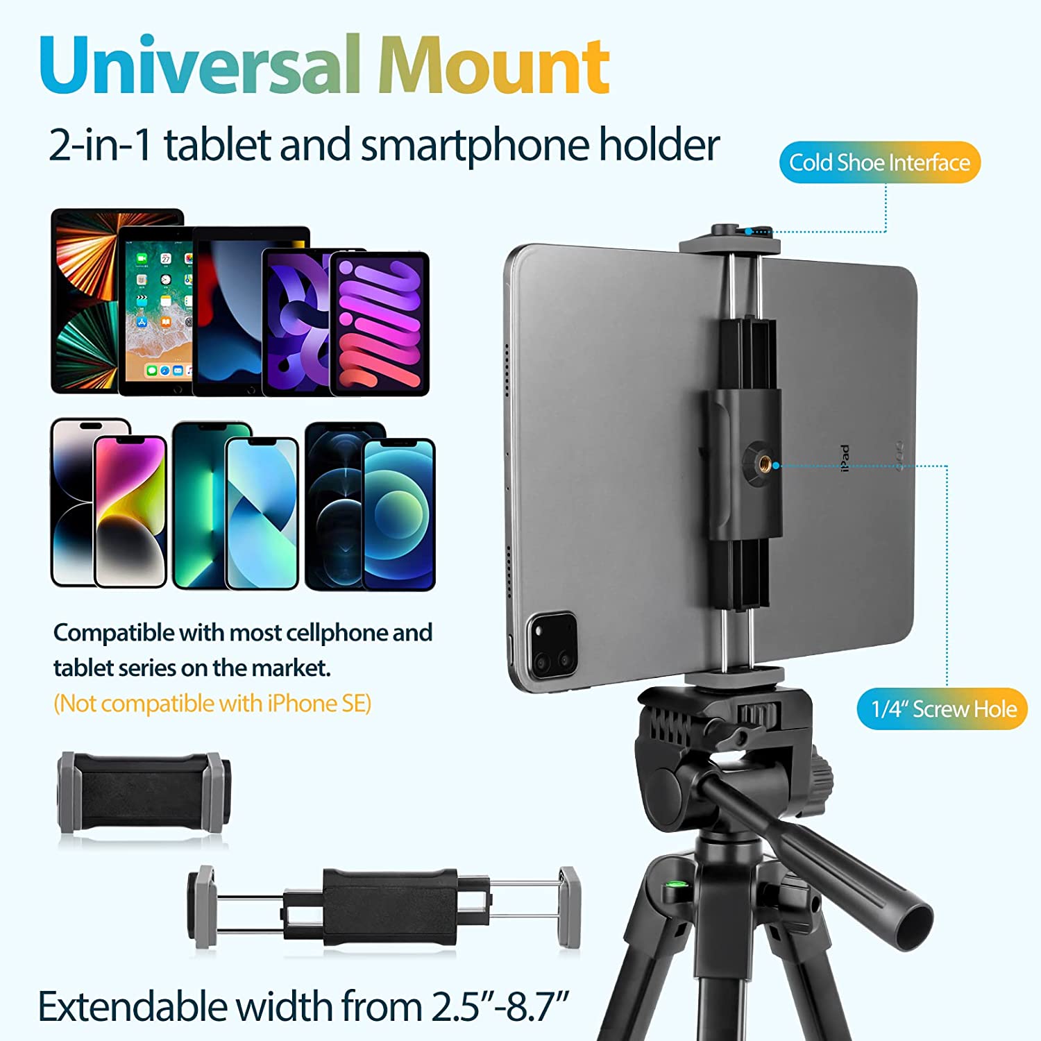 • 【2-in-1 Universal Phone and Tablet Holder】The 2-in-1 clip breaks through the limitations of traditional design, and integrates the adaptability of different devices. Not only compact and sturdy, but also easy to be extended from 2.5in-8.7in wide, compatible with iPad mini, iPad, iPad Air, iPad Pro, and many other tablets. For smartphones like iPhone6, 6s, 7, 7plus, 8, 8plus, x, XR, xs, xs max, iPhone 11, 12, 13, 4series/Samsung, Xiaomi, Huawei, etc.