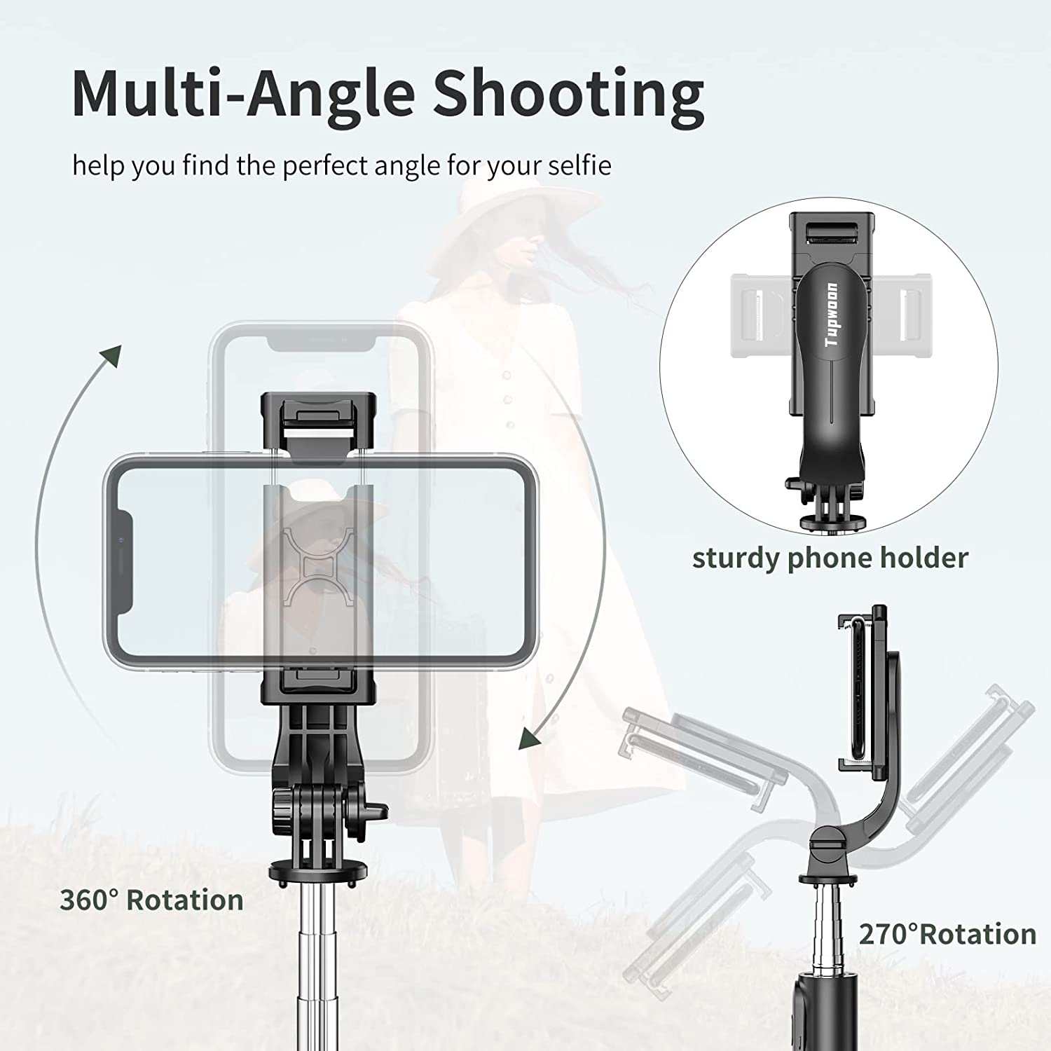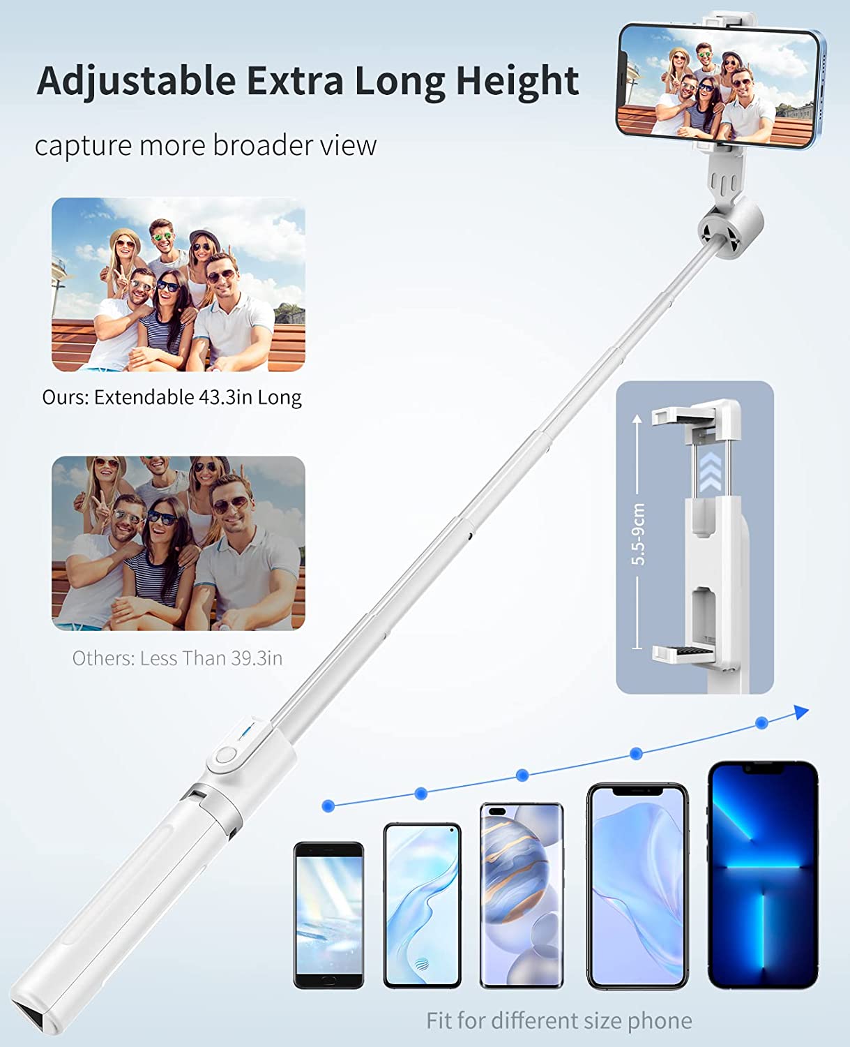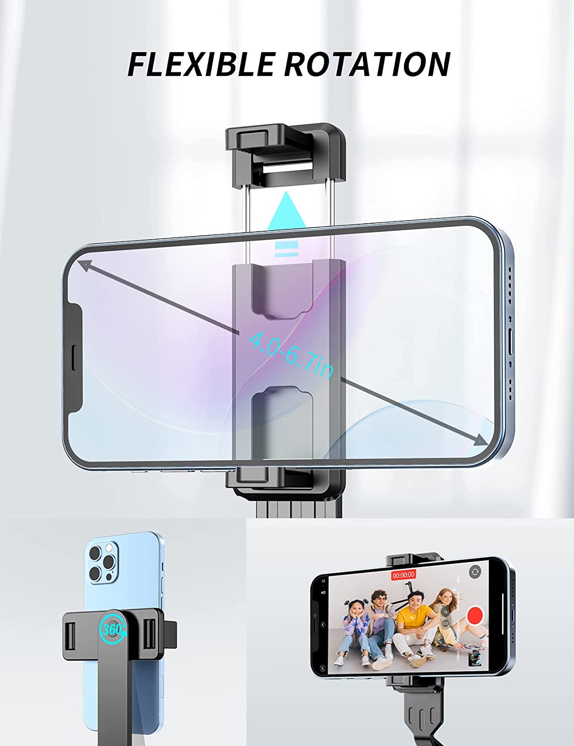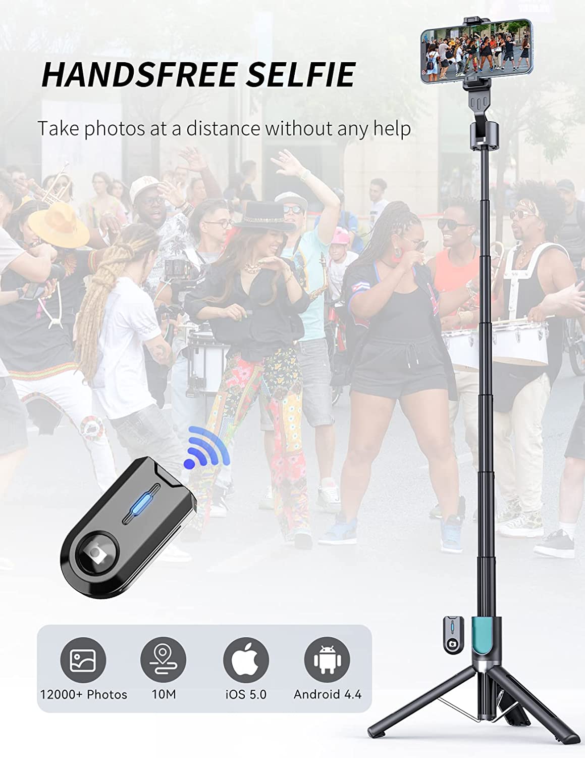 • WIDE COMPATIBILITY -- The extendable phone tripod enables multi-angle shooting fit for a more diverse device. And the selfie stick is compatible with iPhone13 Pro/13/12 Pro/12 /12mini 11pro/11/XR XS, Android, and GoPro. As it is foldable and portable, the stick is super great when you want to capture photos or videos during trips.