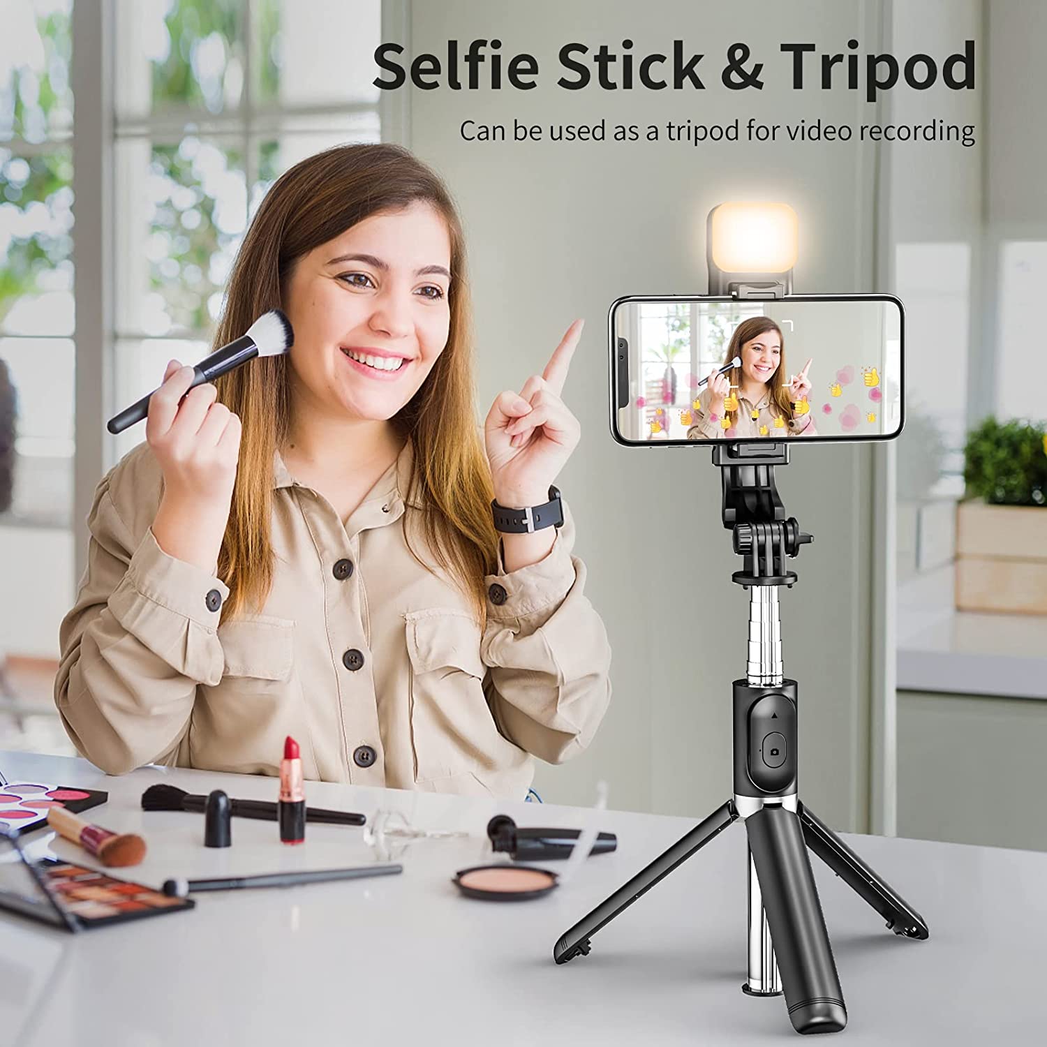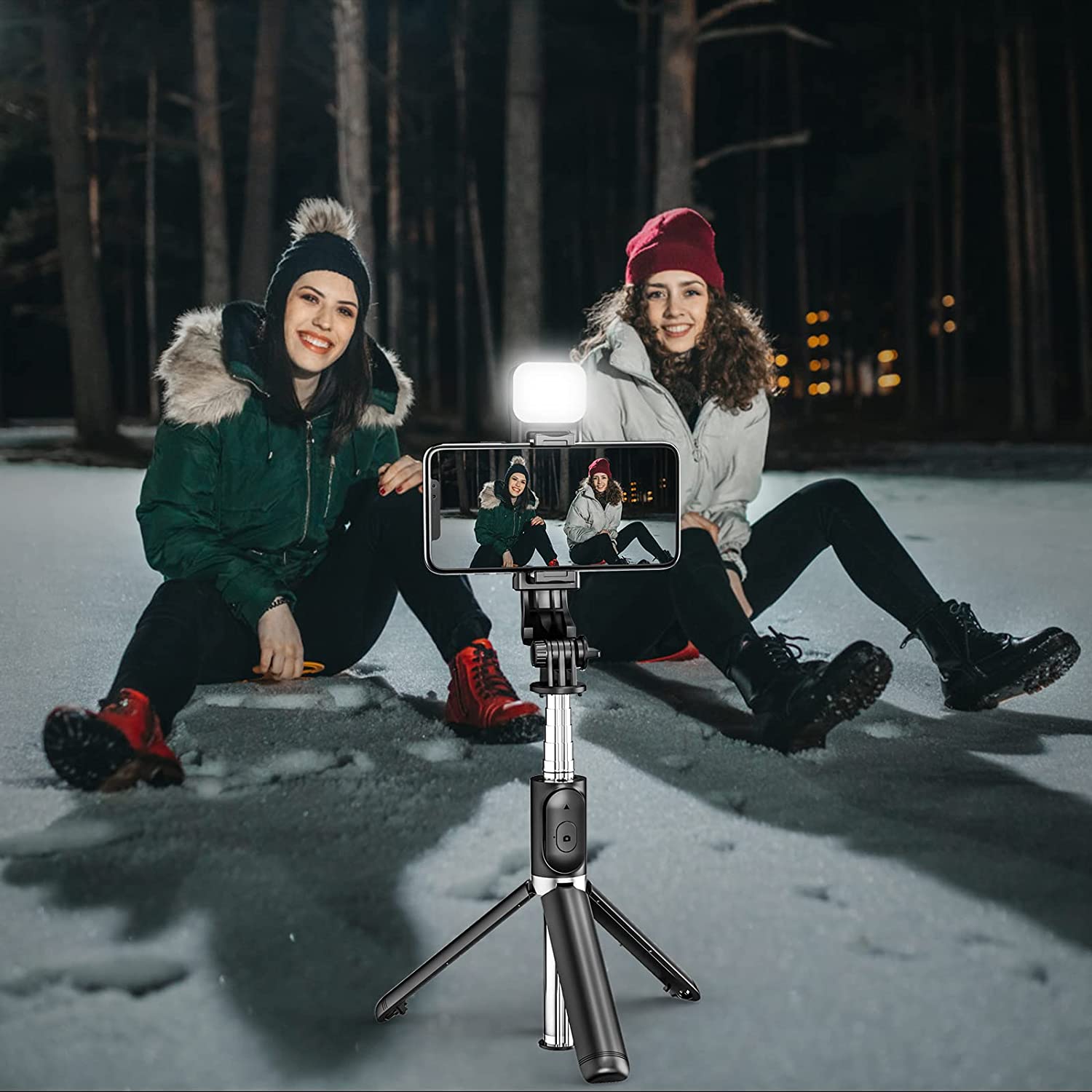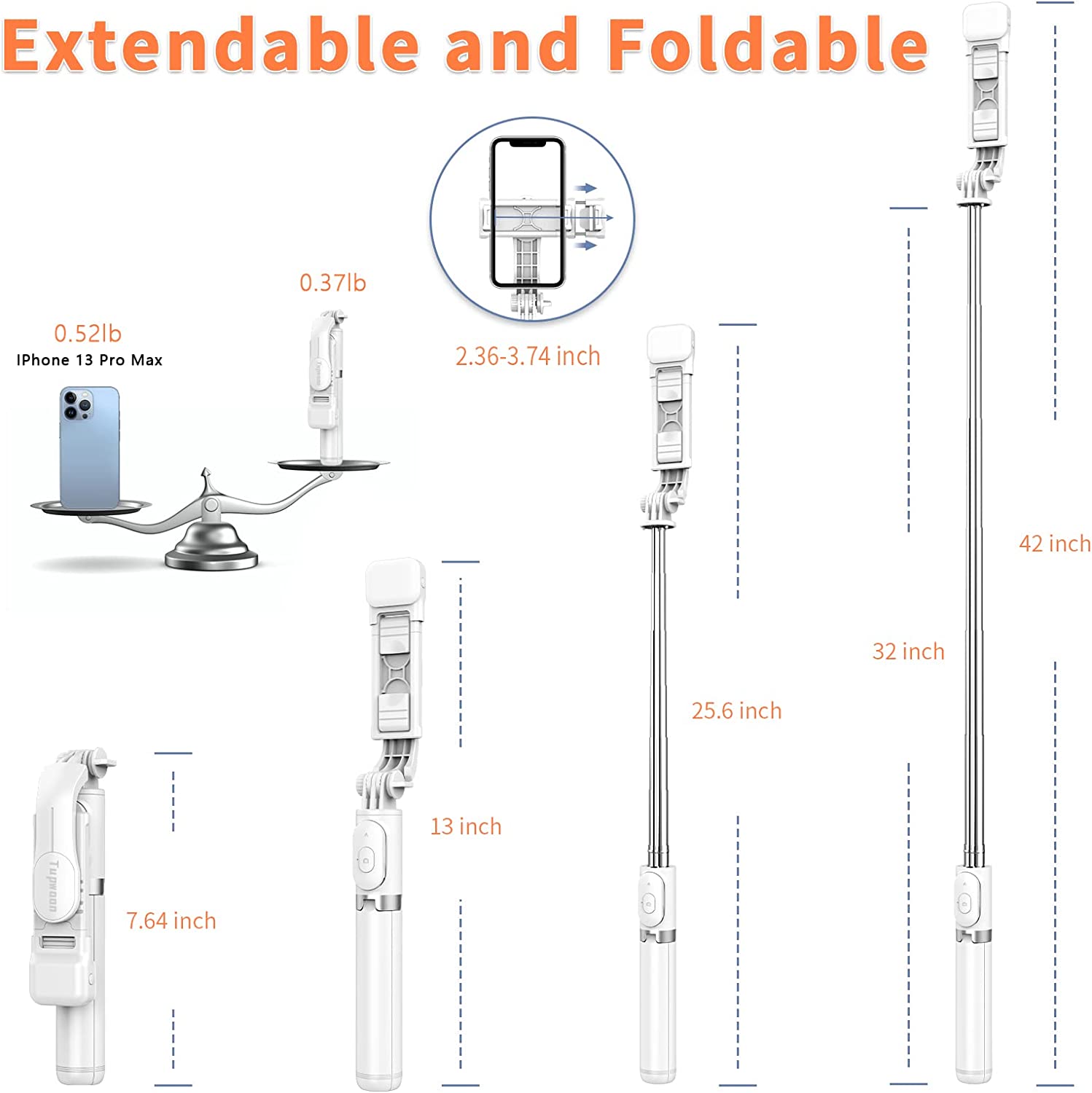 • DURABLE AND LIGHTWEIGHT -- The selfie stick measures 42.1inch, including 1.1inch light ring. And it only weighs 0.37lb,so easy to carry. What is more, it can be folded in 7.6inch with a battery inside. Such features make our selfie stick a great gift for selfie accessories.