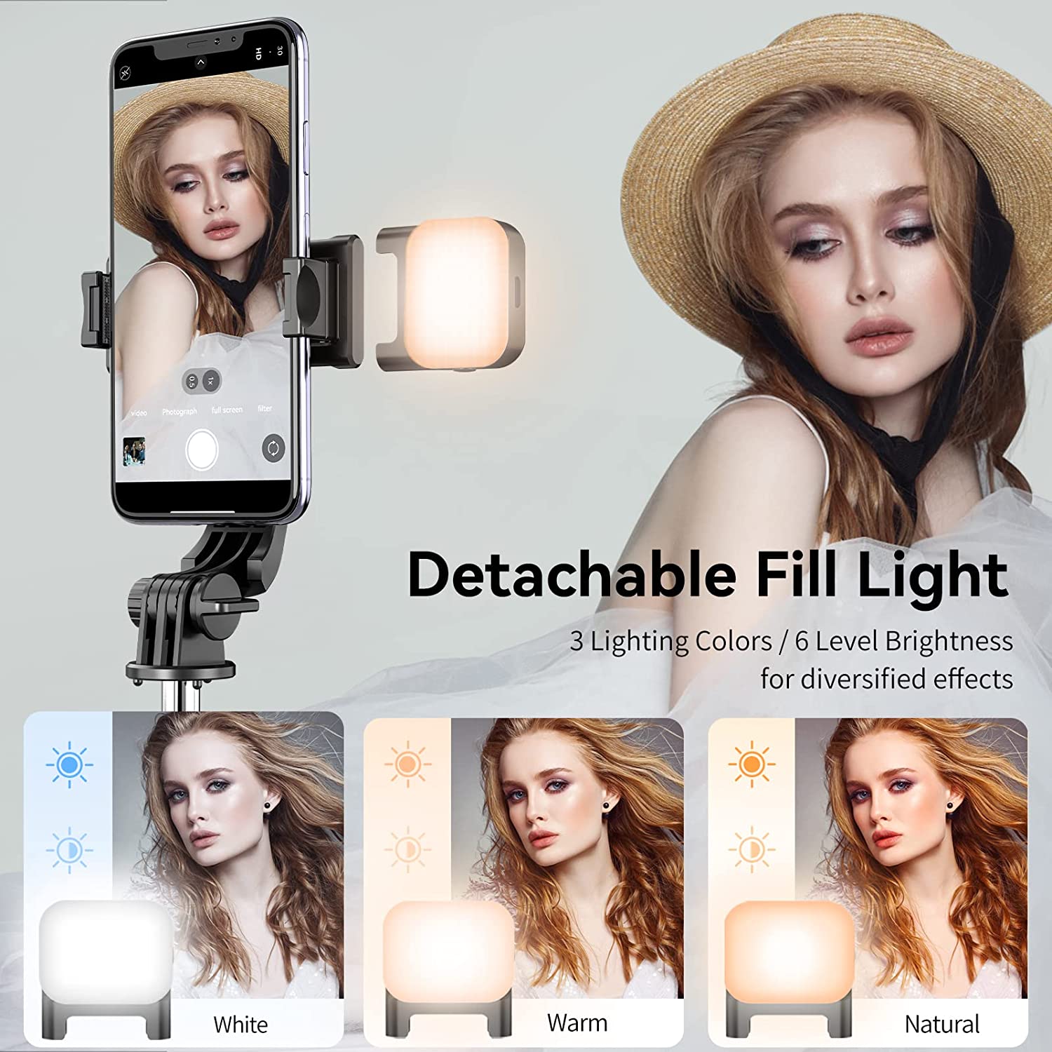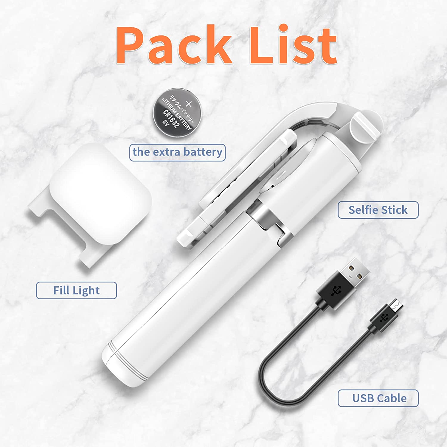 • SELFIE STICK WITH LIGHT -- The selfie stick with a detachable fill light can be charged via a USB cable. You can long press to open the fill light and short press to adjust brightness levels. Compared with the average selfie stick, it can also take perfect photos in poor light conditions, and it is also a useful toolkit for your life and work.